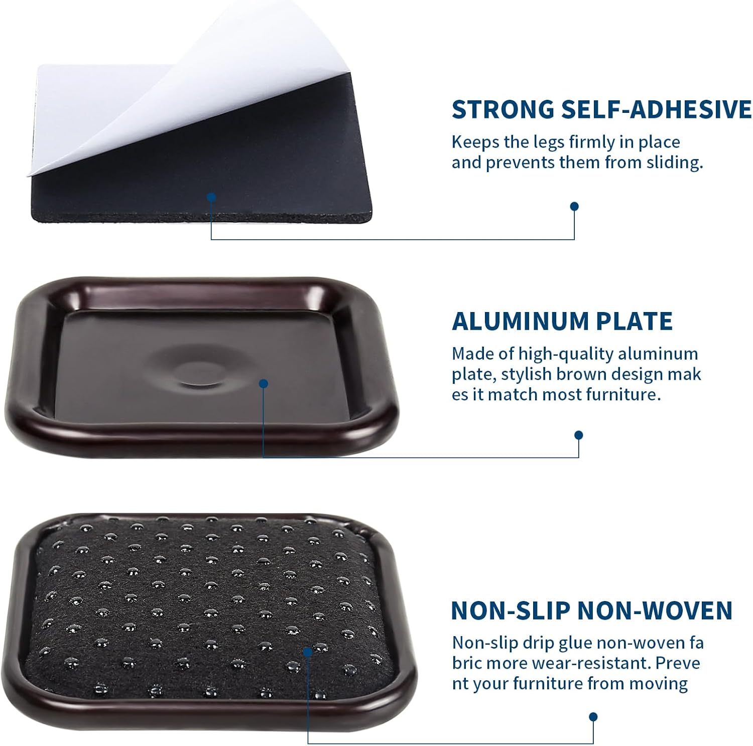 - 【Easy Installation】Step 1: tear off the white cover and press self-adhesive onto the surface of the aluminum plate. Step 2: slide them under your furniture legs and leave them for 10 minutes. Step 3: done.