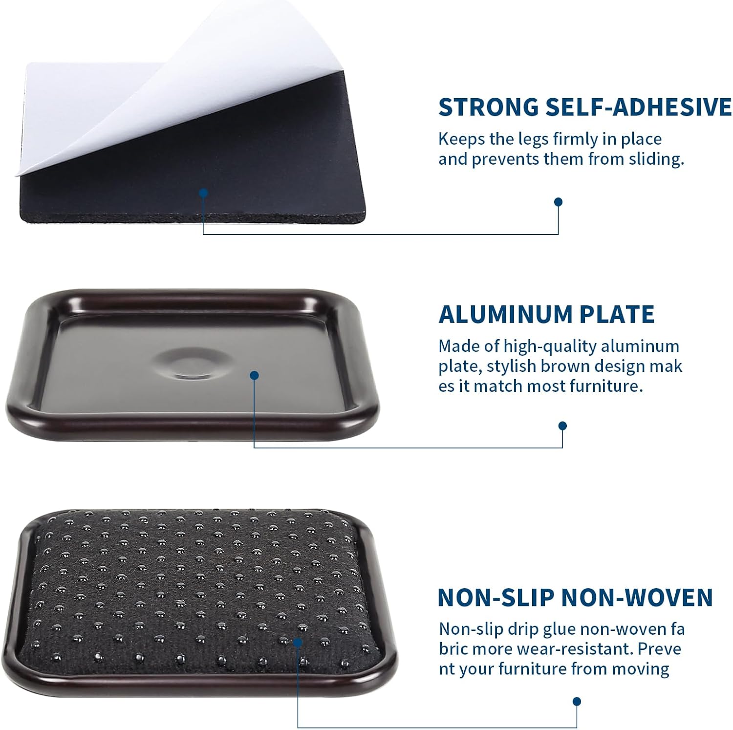 - 【Easy Installation】Step 1: tear off the white cover and press self-adhesive onto the surface of the aluminum plate. Step 2: slide them under your furniture legs and leave them for 10 minutes. Step 3: done.