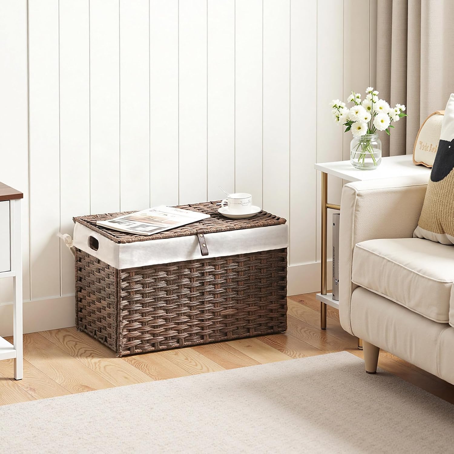 - Thoughtful and Convenient: The storage basket's lid has a PU handle for a comfortable grip. Non-slip foot nails prevent sliding and protect the floor. The hollow-out handles on the sides make it easy to move and reposition