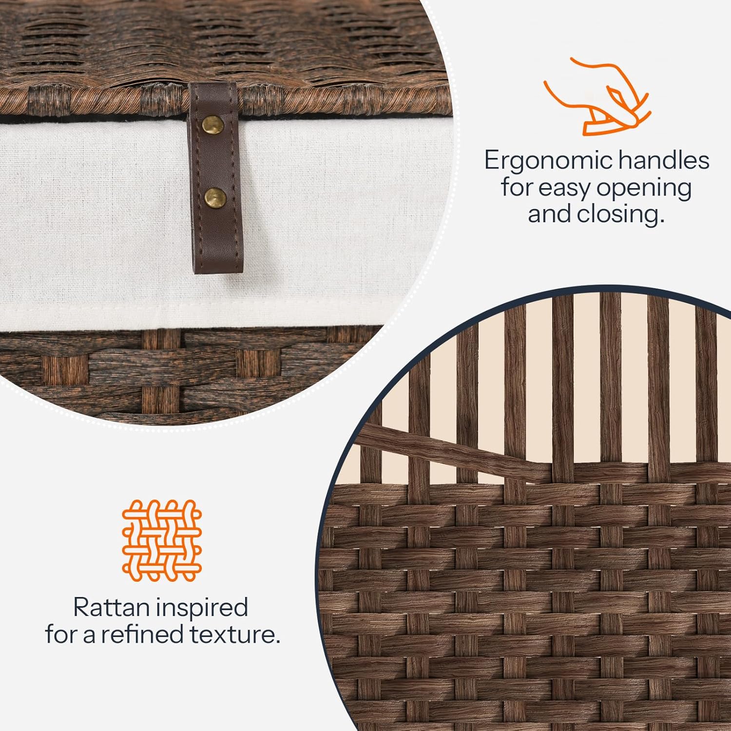 - Premium and Easy-to-Clean Material: The boho storage bin uses high-quality PVC rattan for its exterior, which is waterproof and breathable. The interior has a soft cotton-polyester lining that protects clothes and can be easily detached for cleaning
