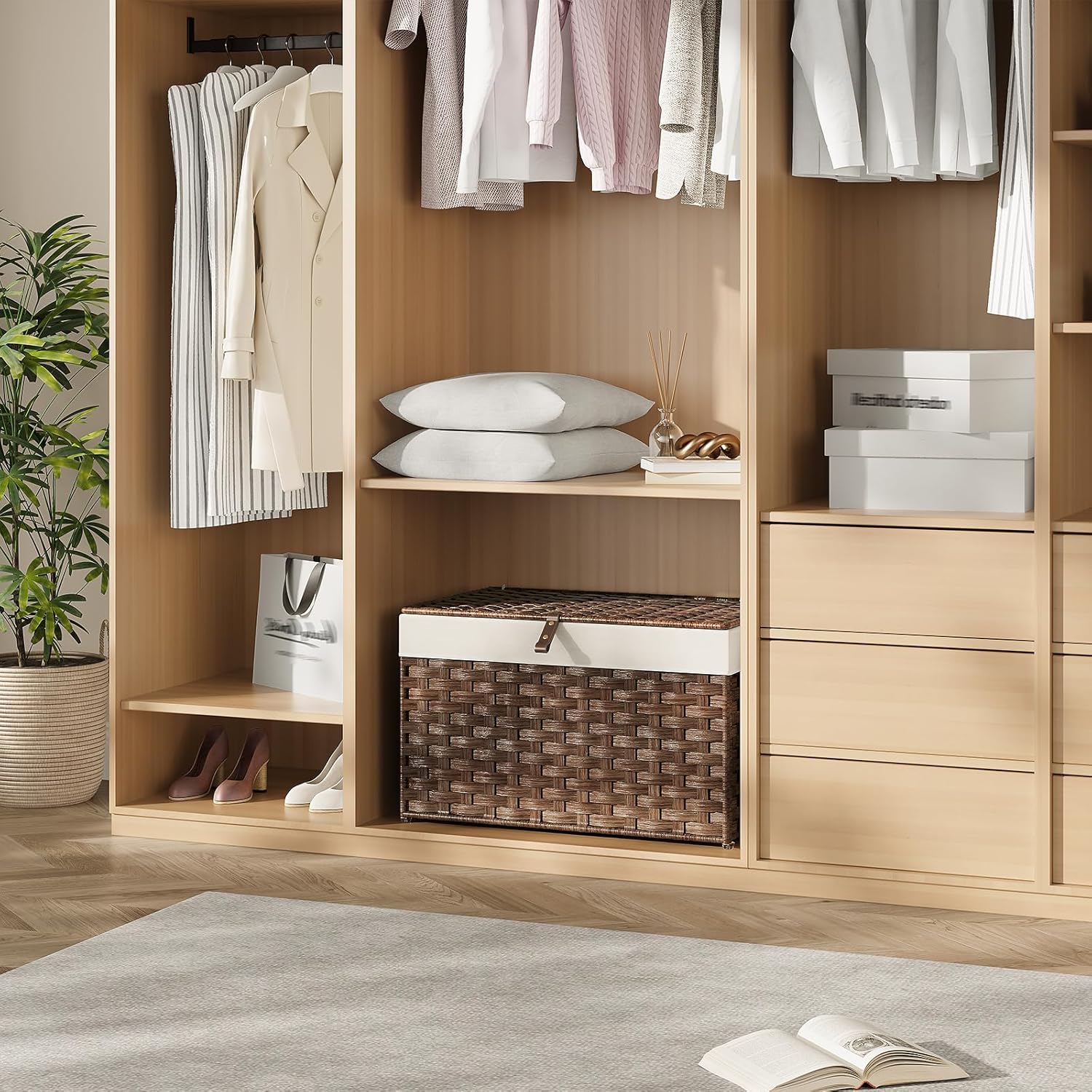 - Ultra-Spacious Storage: This 65L storage basket is a clutter-buster for bedrooms, etc. Its full-open lid lets you swiftly grab or stash clothes and blankets. No more messy chaos; it turns your space into a neat, organized haven