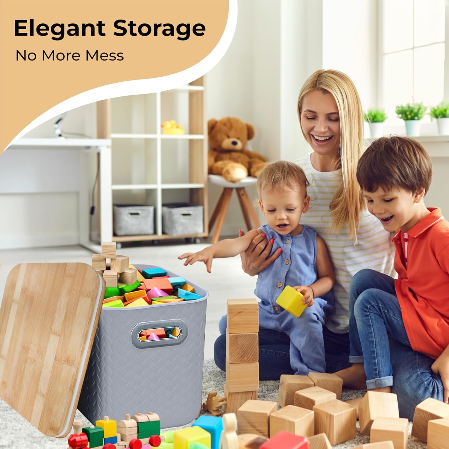 - Eco-Friendly Bamboo Lid for a Sustainable Touch- Each bin includes a natural, sustainable bamboo lid that helps conceal clutter while keeping contents dust-free. The lid is not only sturdy and eco-conscious but also enhances the clean, organic aesthetic of your storage space.