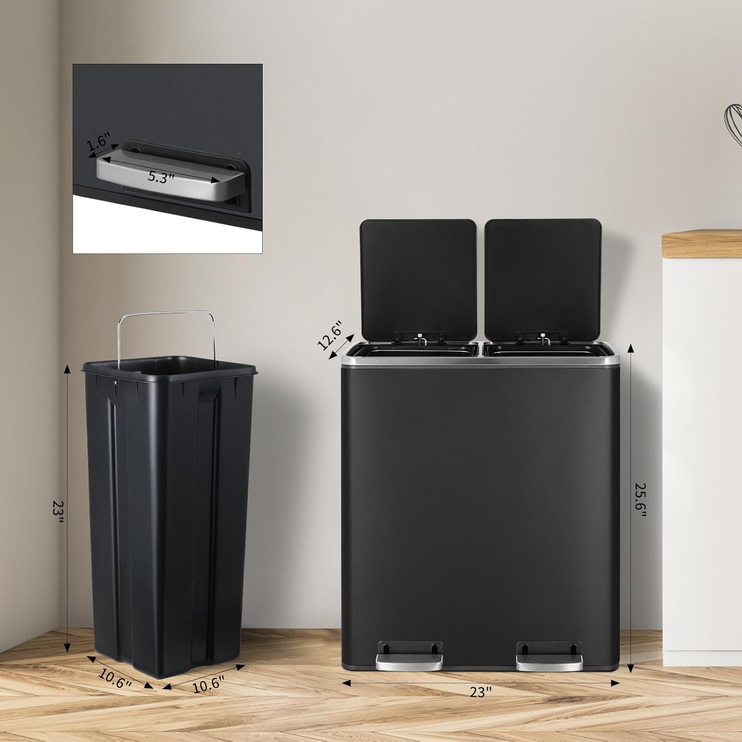 - Free-Hands : Dual compartment trash can uses a foot pedal switch, which can free your hands. Widened pedal also makes it more comfortable to step on. Dual kitchen trash can also has a portable handle, making it easy to move the hands free trash can