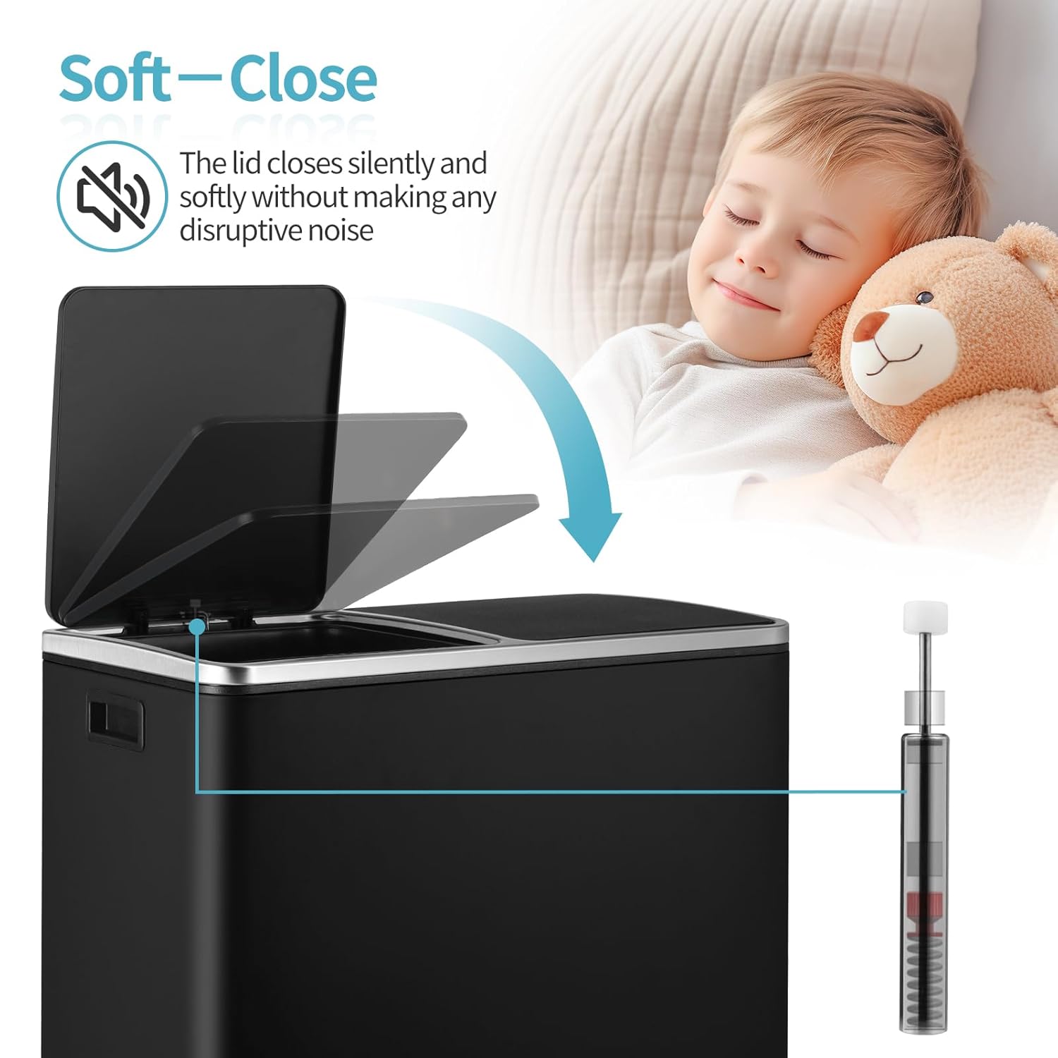- 2 Slow-Down Lids: Kitchen trash can with lid made of ABS plastic is designed with slow-down. Slow-down lids can keep the recycle bins for kitchen silent and reduce wear. At the same time, the lids have locks that can keep the dustbin open when in use