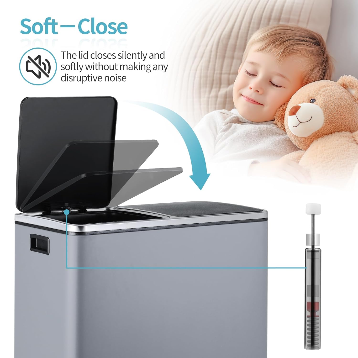 - 2 Slow-Down Lids: Kitchen trash can with lid made of ABS plastic is designed with slow-down. Slow-down lids can keep the recycle bins for kitchen silent and reduce wear. At the same time, the lids have locks that can keep the dustbin open when in use