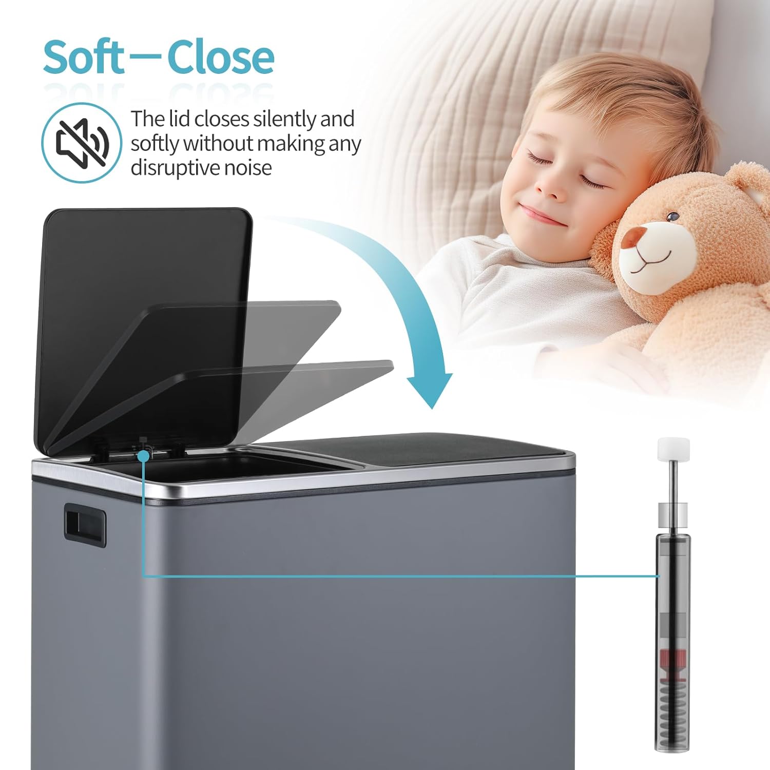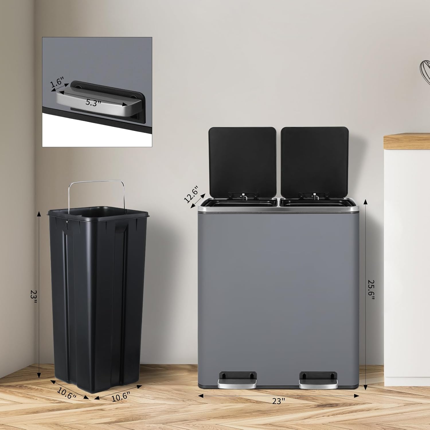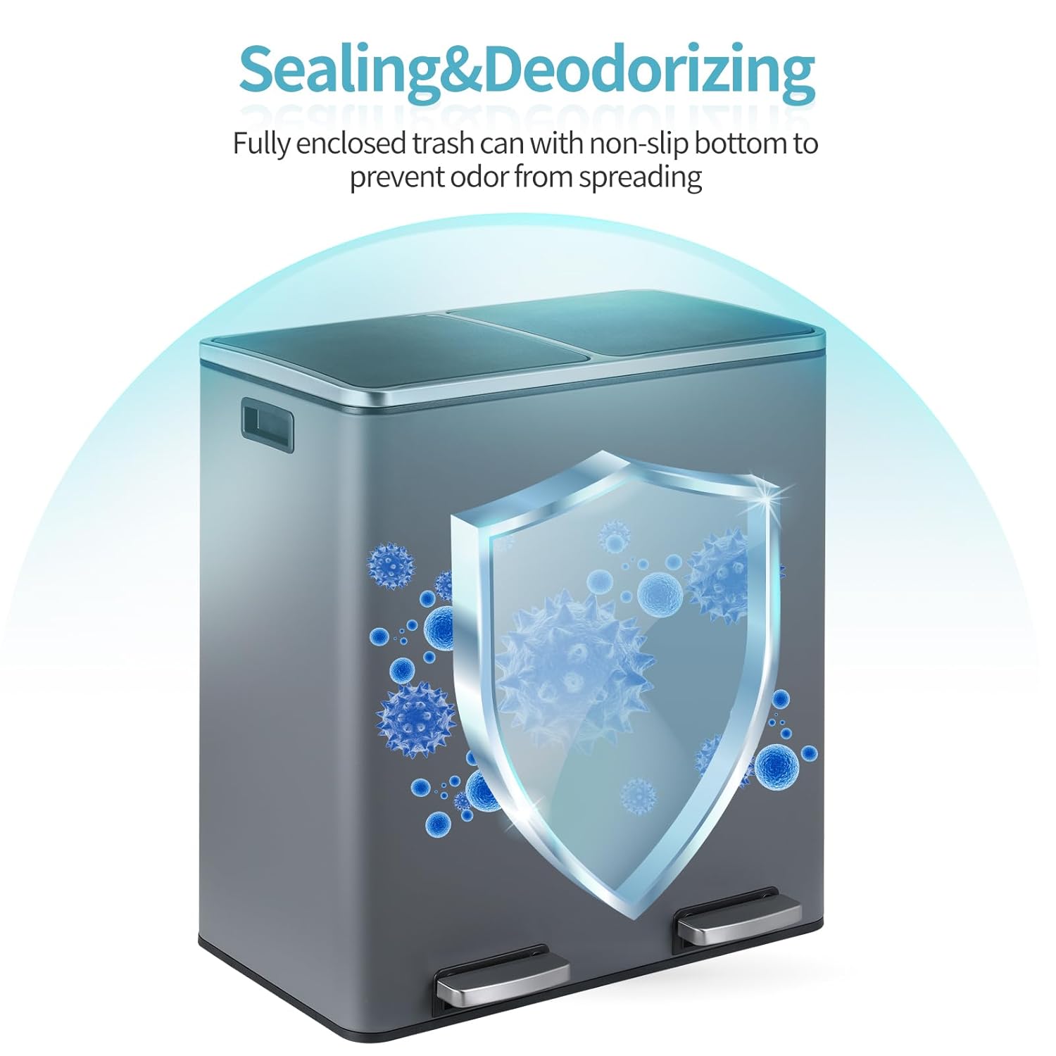 - 2Ă—8-Gallon Compartments: 16-gallon step trash can has two compartments, combining garbage and recycling. Completely separated dual garbage and recycling can also avoid the smell of garbage. 2 removable inner buckets increase convenience