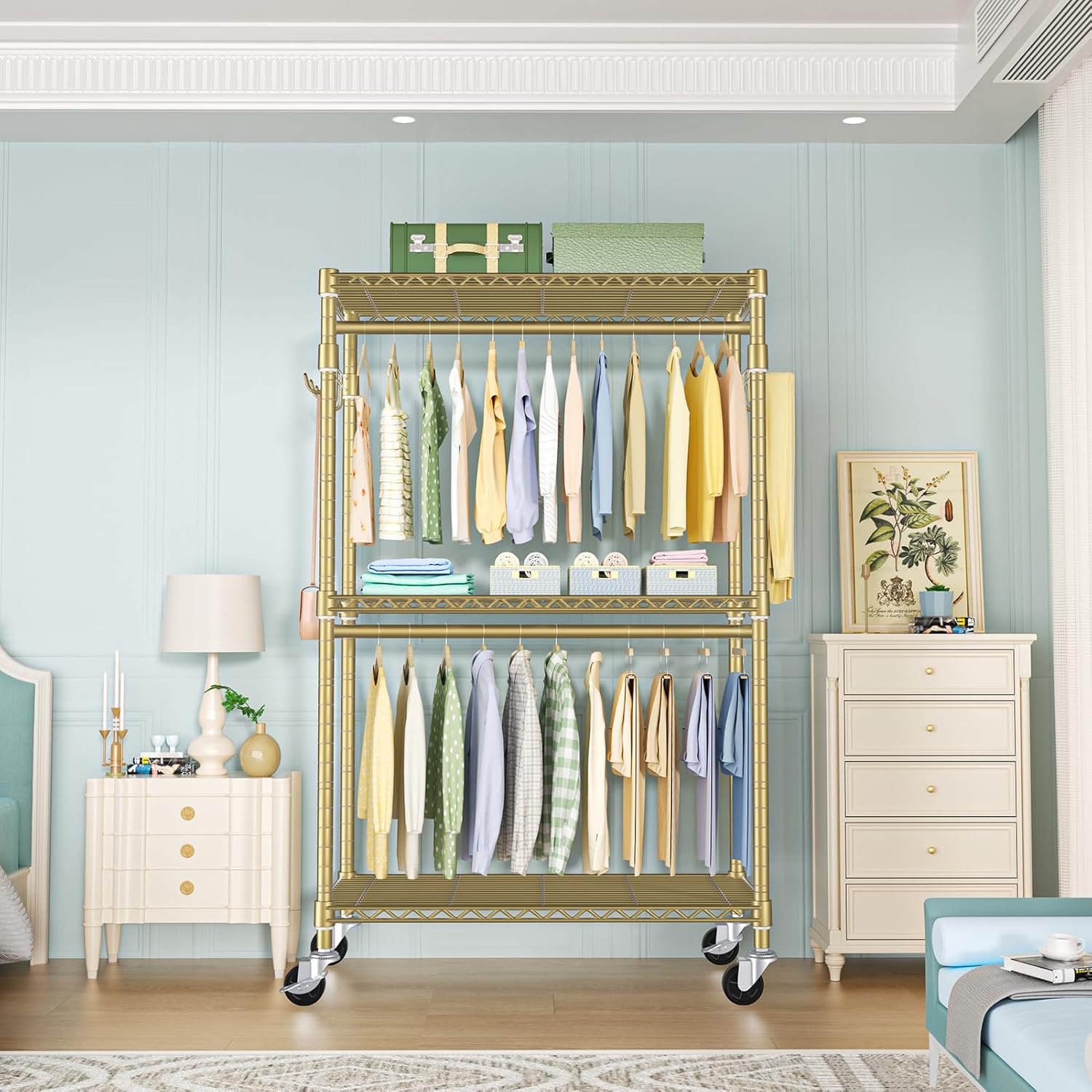 FUTASSI P1 Rolling Clothes Rack, Movable Metal Garment Closet Organizer with Lockable Wheels, Clothing Wardrobe with Double Hanger Rods and Hooks, 35.4" W x 15.7" D x 80.5" H, Load 450lbs, Gold