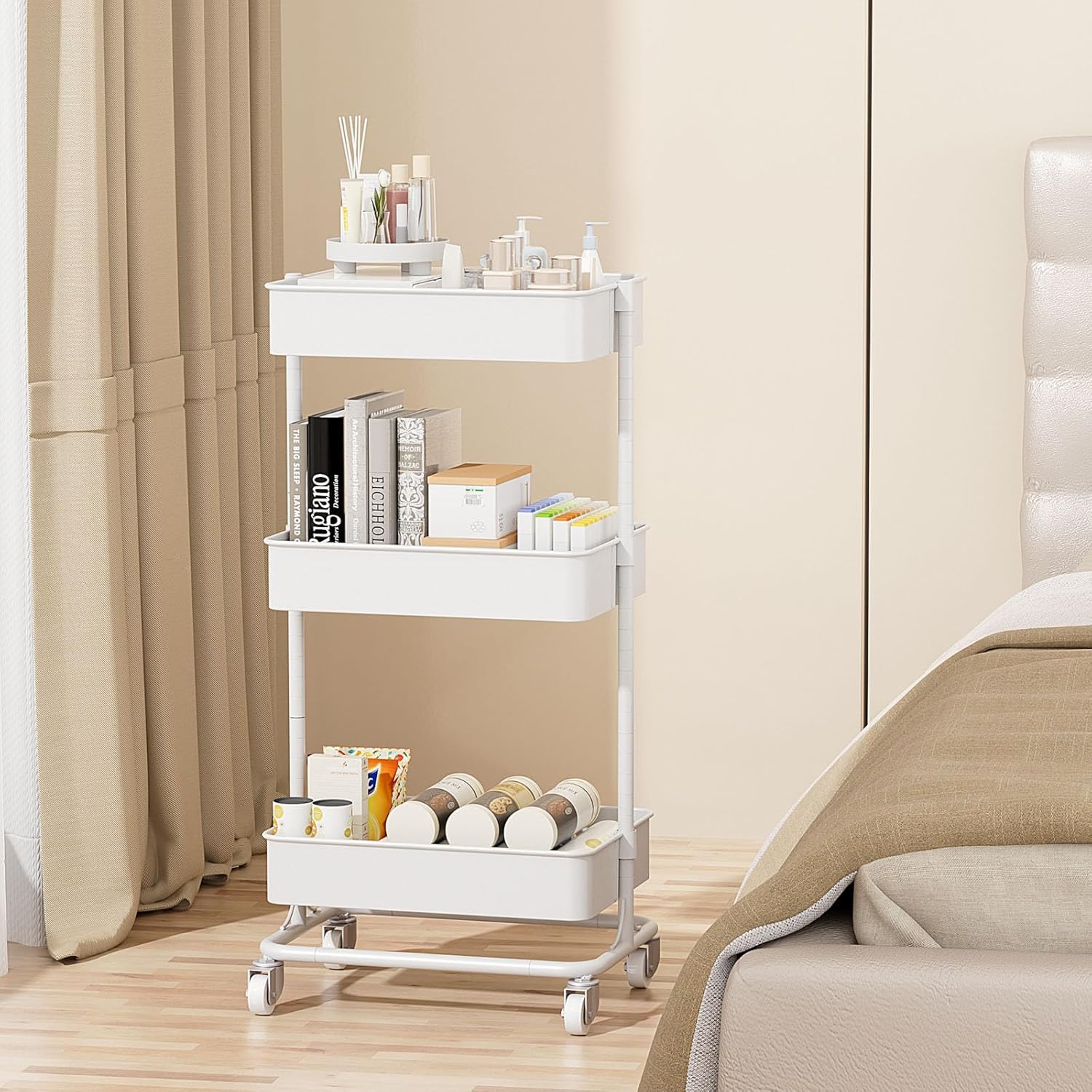 - Large Capacity:3 tier rolling cart ,users can freely adjust the distance between each layer according to the height of the items being stored. This flexibility allows the shelf to accommodate items of various sizes, improving space utilization. Additionally, metal rolling cart with wheels features hooks for hanging kitchen utensils, towels, and other small items, enhancing convenience and practicality. perfect for kitchen accessories, tools, plants, art supplies, toiletries, office supplies, bookshelf and more.