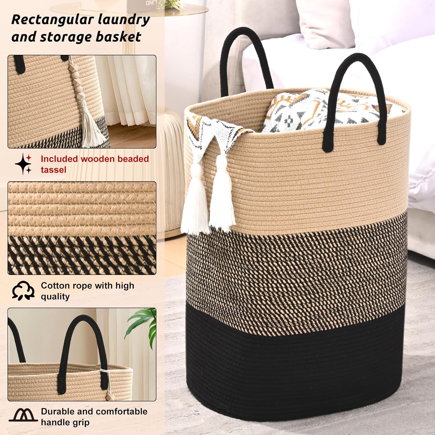 - 🎀[LARGE LAUNDRY HAMPERS WITH WOODEN BEAD TASSEL]: Laundry hamper features a wooden bead tassel that is not only makes baby laundry hamper looks boho, but also matches with different room styles, It can perfect for adding to storage baskets for a classy look!