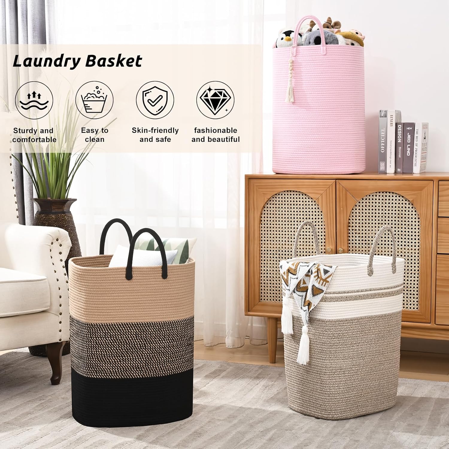 - 🌈[DURABLE, BREATHABLE & SKIN - FRIENDLY COTTON]: Made of sturdy and odor-free rope cotton, woven laundry basket has a solid addition to any space. Tall laundry basket quite sturdy and spacious, capable of holding a good amount without losing its shape, which adds to its practicality.