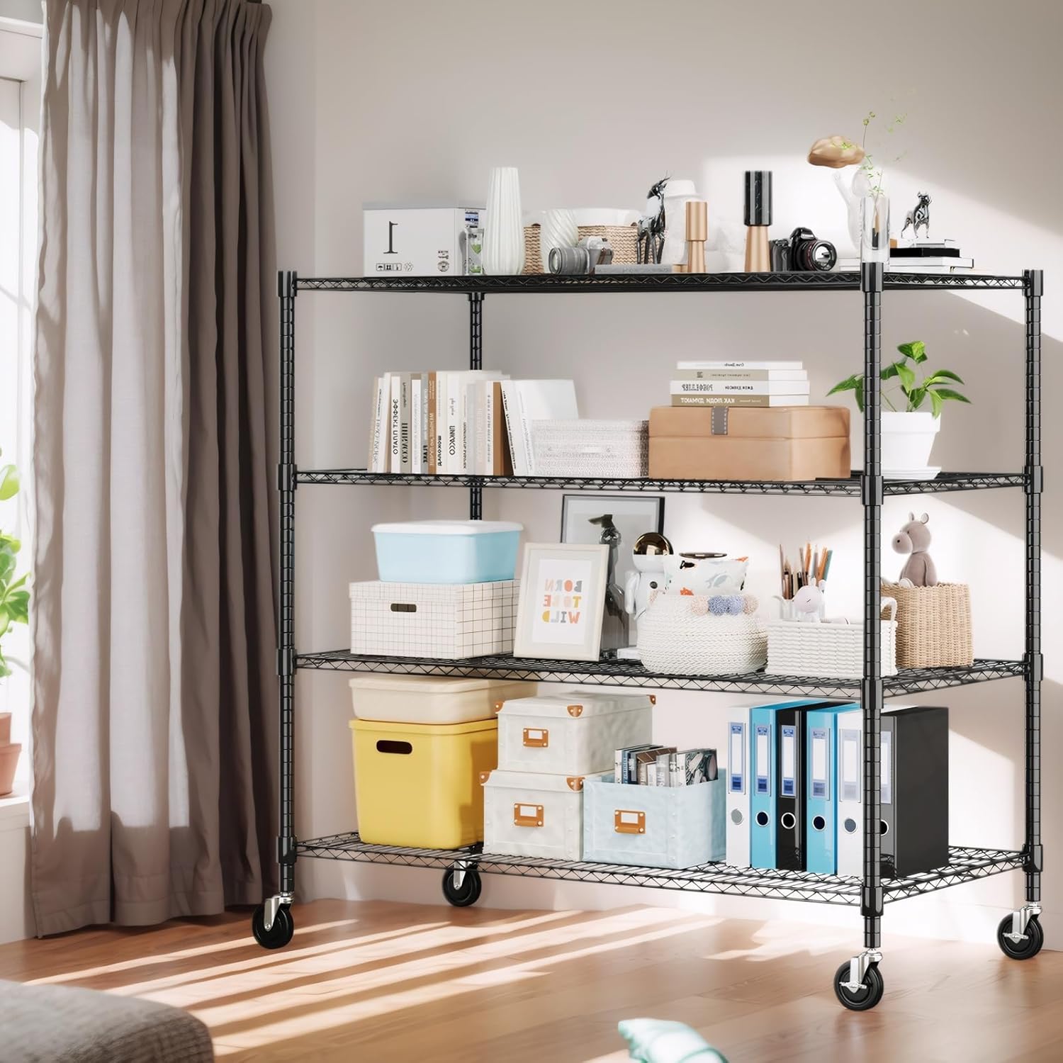 - 【LARGE STORAGE SHELVES】The size of metal shelving with wheels is 24" x 48" x 72" (76"H on leveling feet). This wire shelving can provide additional storage space without occupying too much space.The appropriate size makes the metal shelves for storage suitable not only for kitchens, bathrooms, storage rooms, living rooms, warehouses, basemnet, offices, commercial exhibitions, hotels, supermarkets, etc