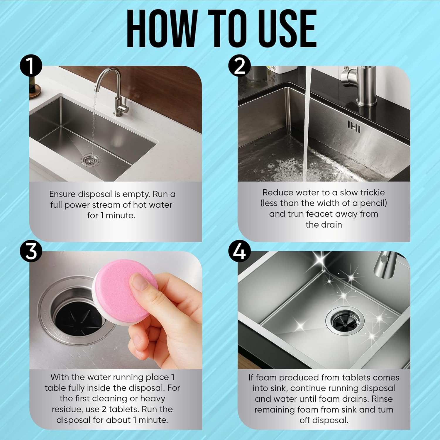 - Quick & Easy to Use – No mess and no tools required. Just drop one tablet in, run warm water, and turn on the disposal. The fast-foaming action reaches deep inside in under 2 minutes for hassle-free cleaning.