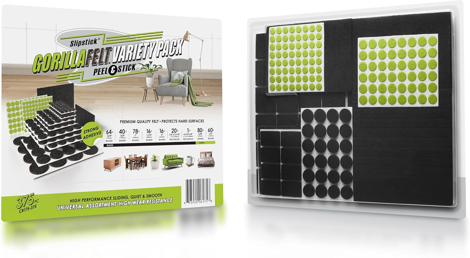 - 375 Piece felt pad variety pack of multiple shapes and sizes – This huge variety pack of Gorilla Felt floor protectors includes (64) 3/8” round, (40) 3/4” round, (78) 1” round, (16) 1-1/2” round, (16) 2” round, (20) 1/2” x 2-1/2” rectangle, (1) 4-1/3” x 6” rectangle black felt pads for furniture as well as (80) 3/8” round and (60) ½” round green felt pad surface protectors for décor and items.
