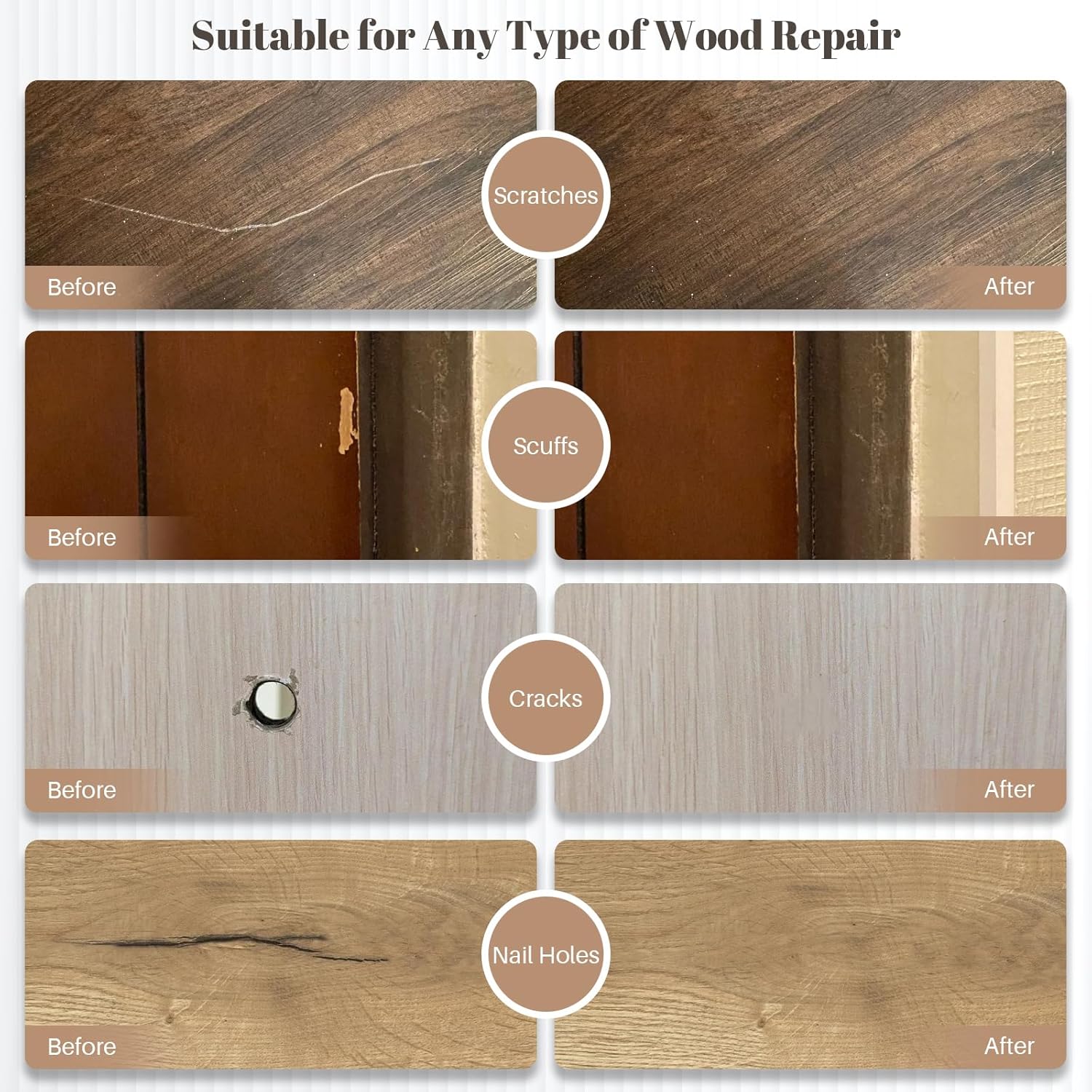 - Widely Used Wood Scratch Repair Kit: The wood scratch repair kit is suitable for all types of wood, repairing scratches, cracks and holes on kitchen cabinets, decorative laminate countertops, furniture, wooden floors, cabinets, tables, doors, etc., blends in perfectly with your furniture