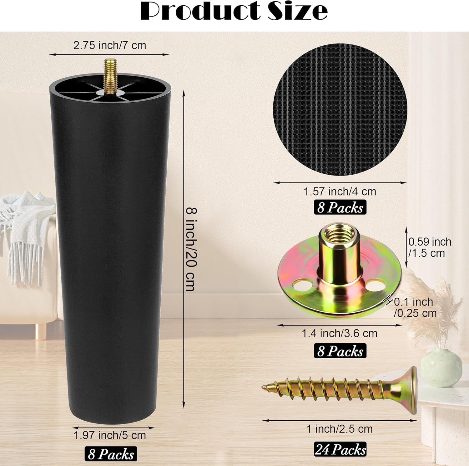 TURSTIN 8 Pack 8 Inch Plastic Furniture Legs with M8 T-Nuts Screws Tapered Sofa Couch and Chair Legs Replacement Furniture Legs for DIY Projects Sofas Coffee Tables Dressers Beds