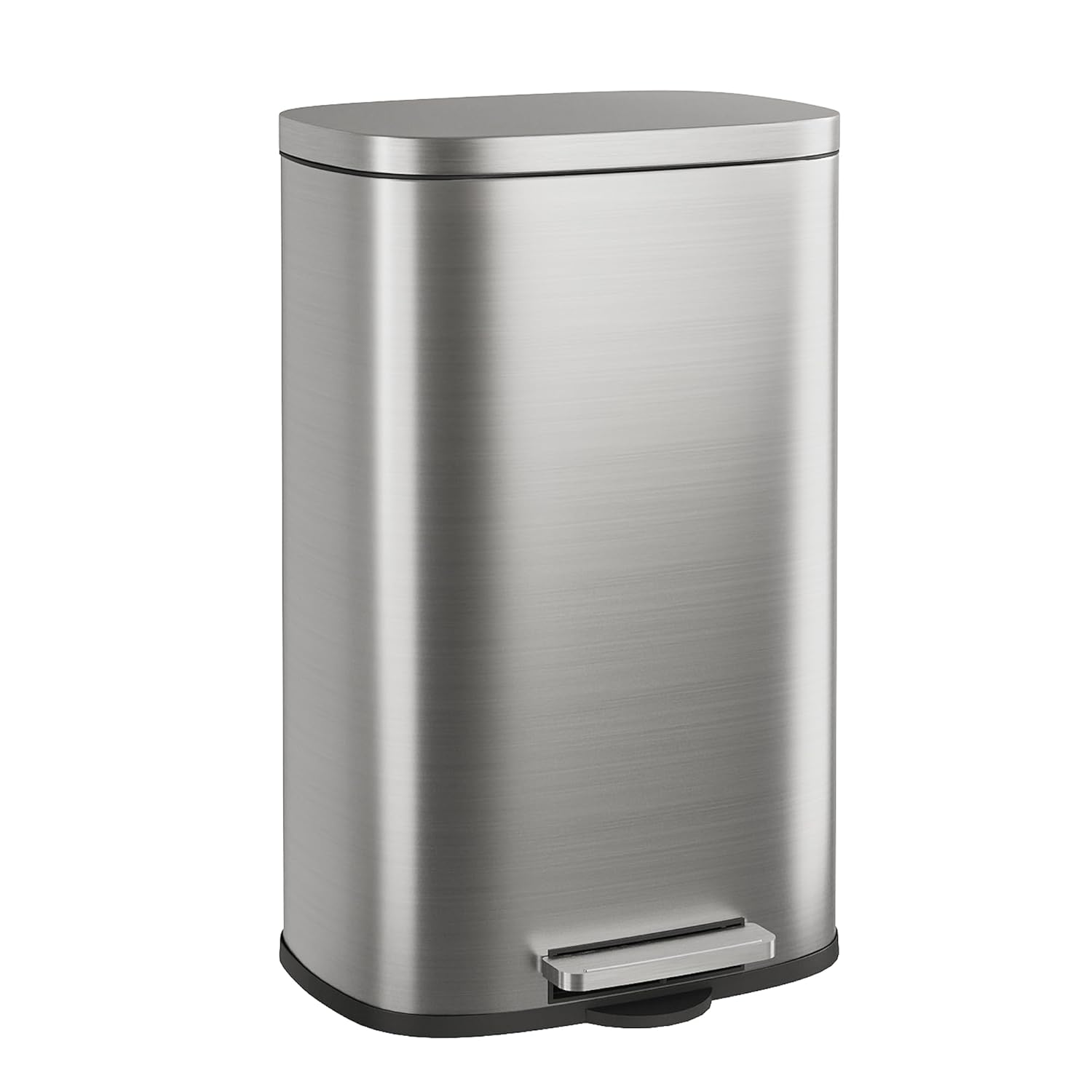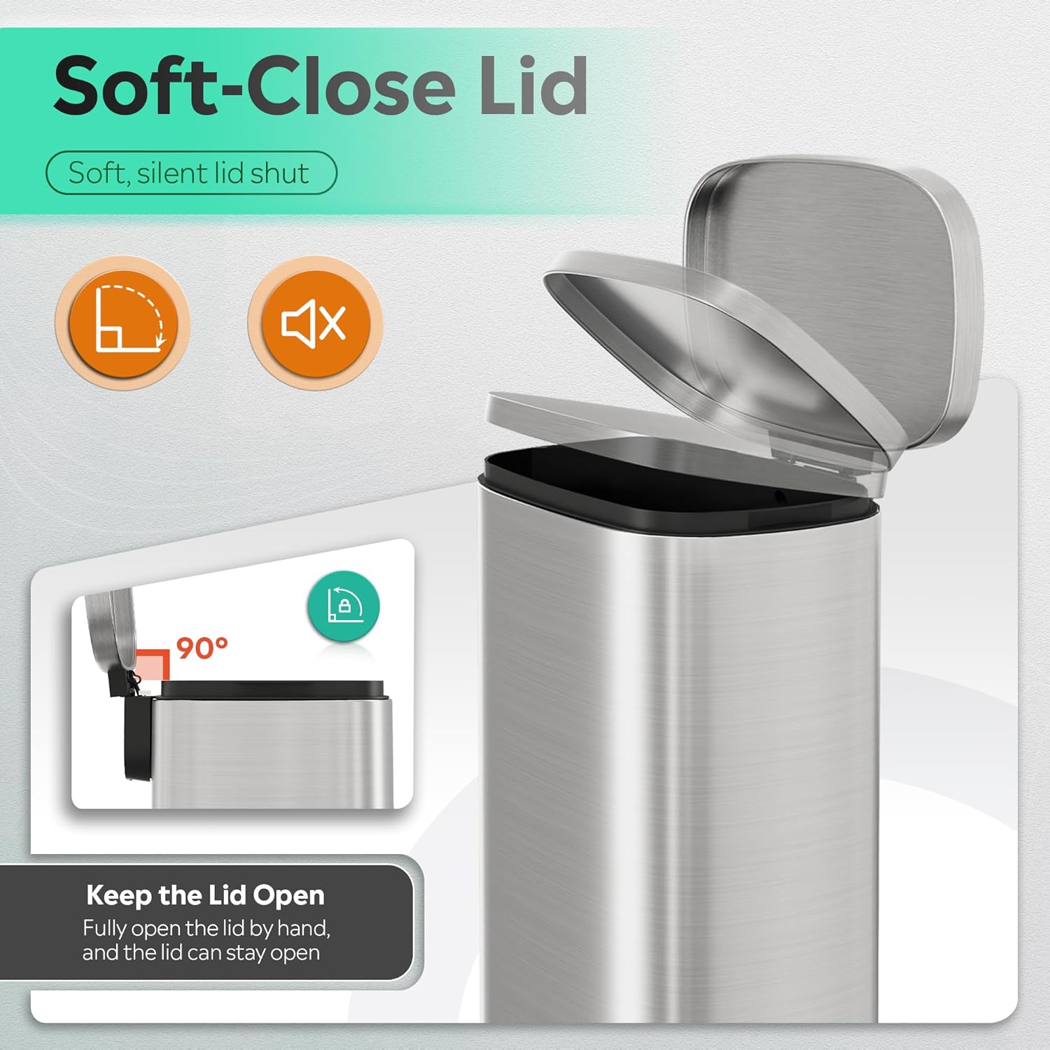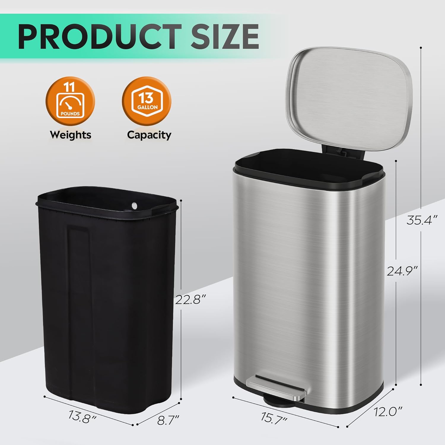 WLIVE 13 Gallon Stainless Steel Trash Can with Inner Bucket, Kitchen Garbage Can with Lid, 50L Soft Close Step Trash Can with Metal Foot for Home, Kitchen, Laundry Room, Office, Silver