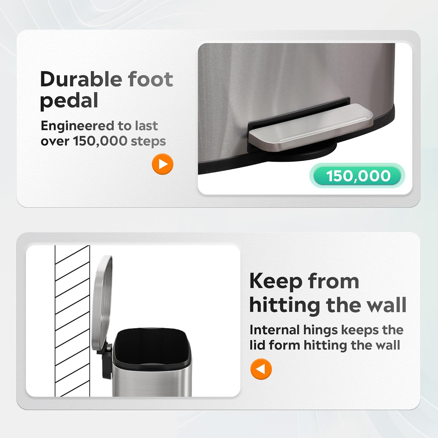 - Hands-free Operation: The ergonomically designed stainless steel foot pedal allows you to open the trash can easily without using your hands. When you need to change the garbage bag or perform a large-scale cleaning, simply push the lid to a 90° angle to keep it open.
