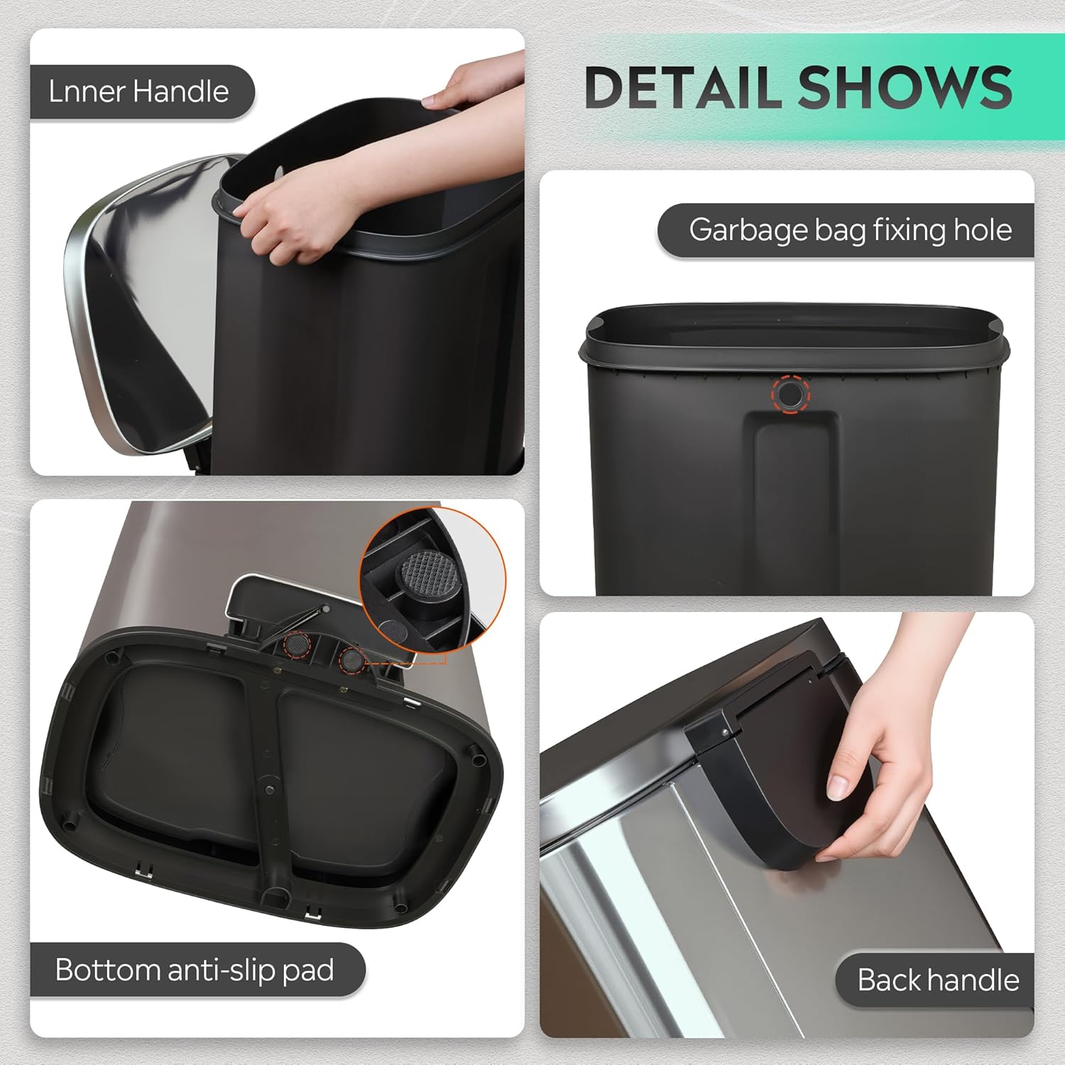 - High-quality Materials: The garbage can is constructed from durable stainless steel, featuring a long-lasting surface that resists fingerprints, stains, and is easy to clean—simply wipe away dirt with a damp cloth to keep it looking fresh.