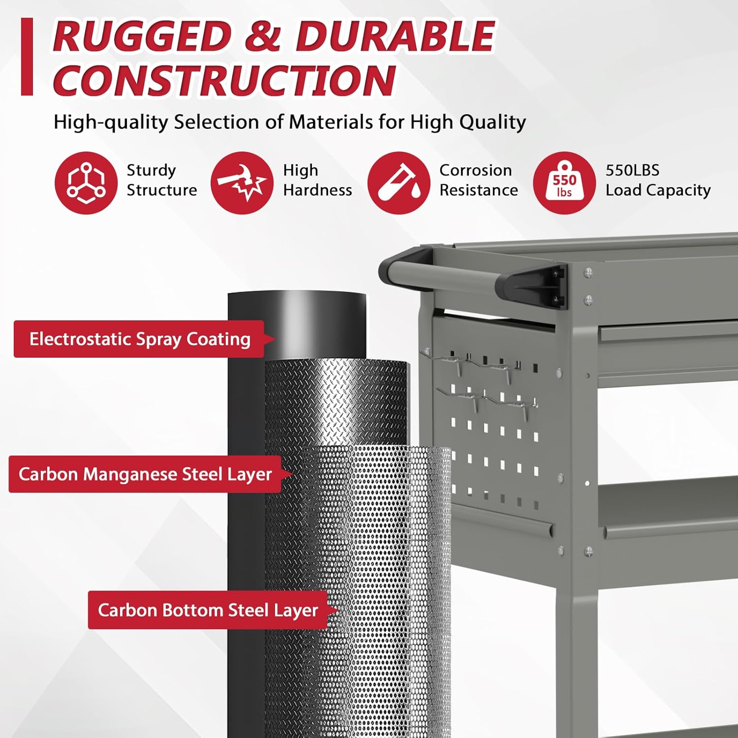 - 🧰【Premium Craftsmanship】: Crafted with precision and attention to detail, the rolling tool cart on wheels is built to last, ensuring it stands up to the rigors of daily use. The maximum bearing capacity of the rolling tool cart is 550 pounds.