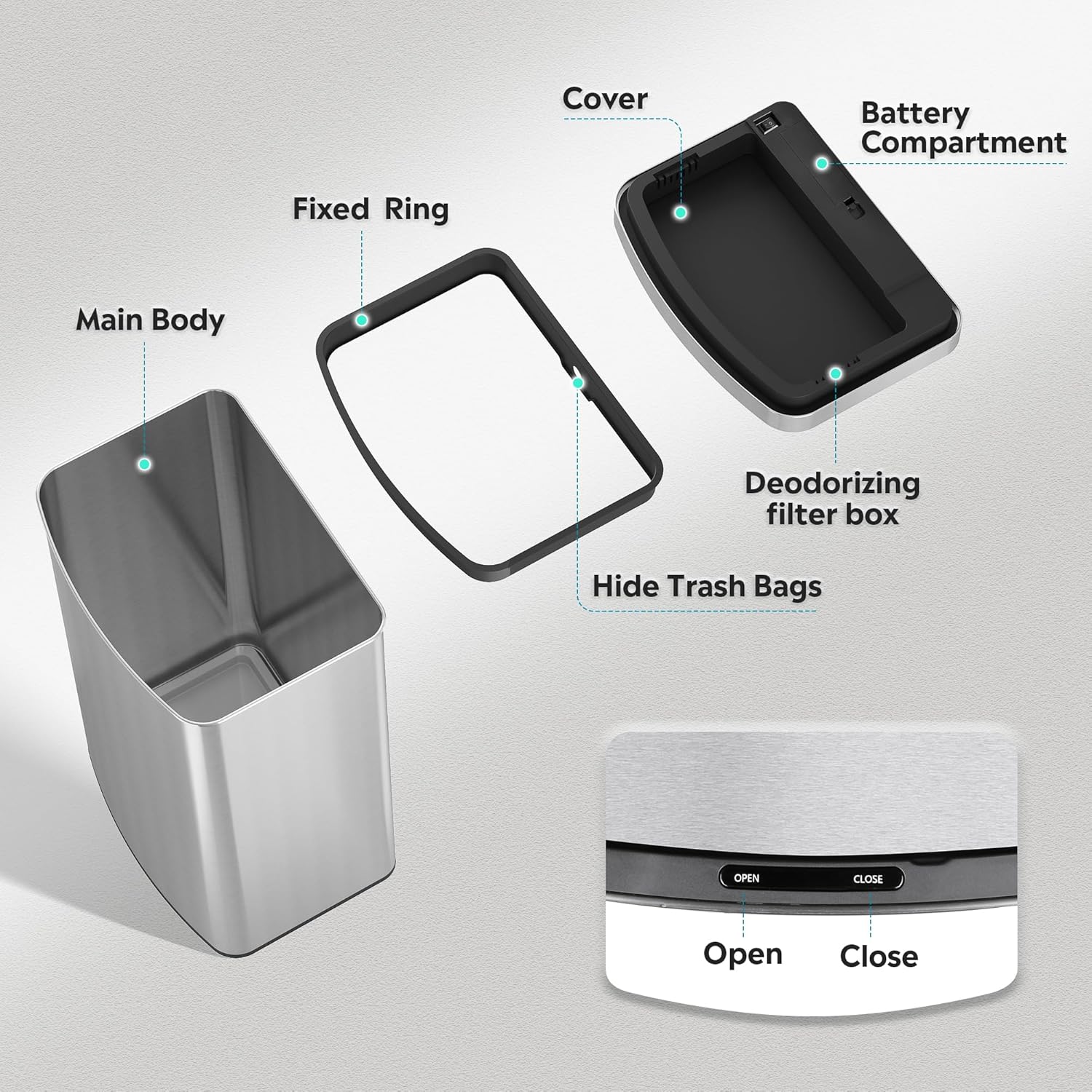 - Neat & Hidden: The integrated retainer ring locks trash bags securely in place and conceals them from view, ensuring a tidy appearance while preventing slips or mess. Sleek and functional, it effortlessly maintains a clutter-free look.