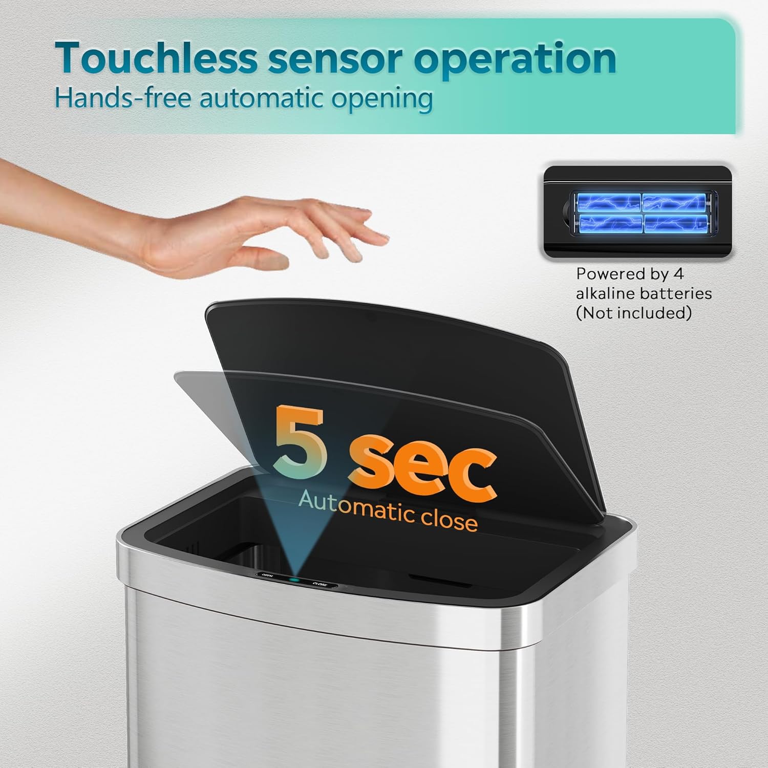 - Closes Softly & Stays Open: Smooth slow-close lid with whisper-quiet operation. Press "OPEN" for 15-minute hands-free use during clean-ups or continuous tasks—hygienic, durable, and designed for daily convenience.