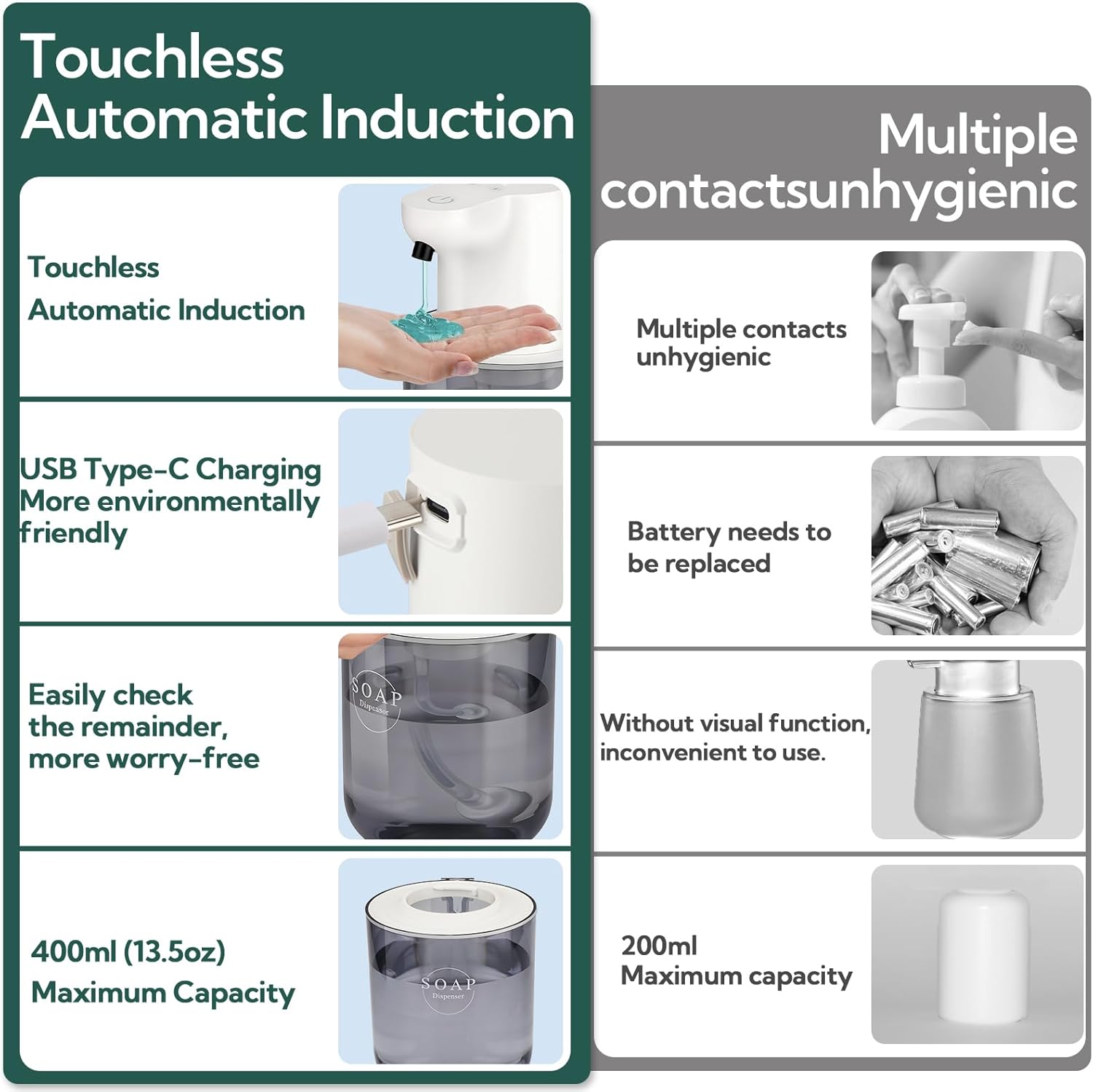 - 【Large Capacity & Long Battery Life】No more disposable batteries! Our foaming soap dispenser features a rechargeable battery, easily powered via USB. Enjoy up to 2-3 months of use on a single charge, depending on usage, for hassle-free, long-lasting performance.