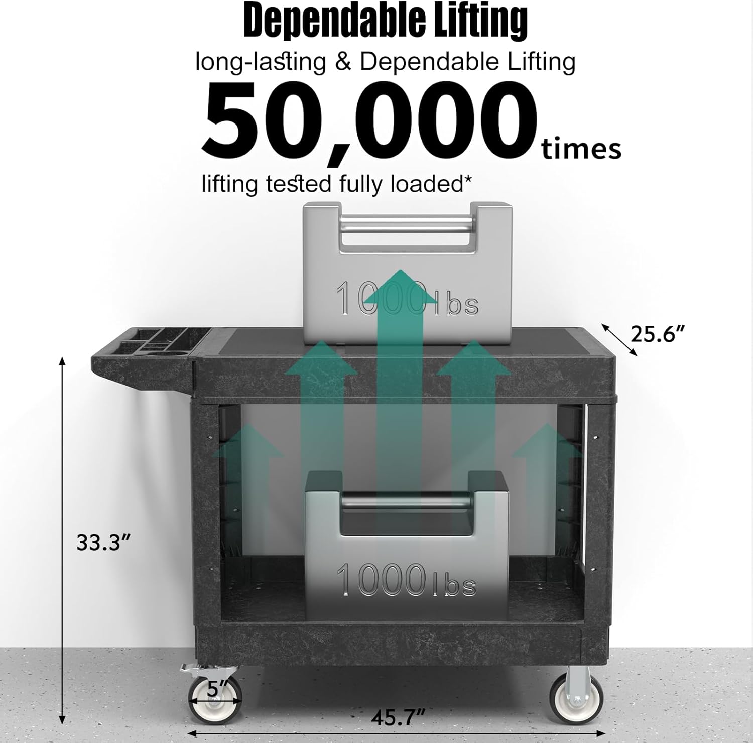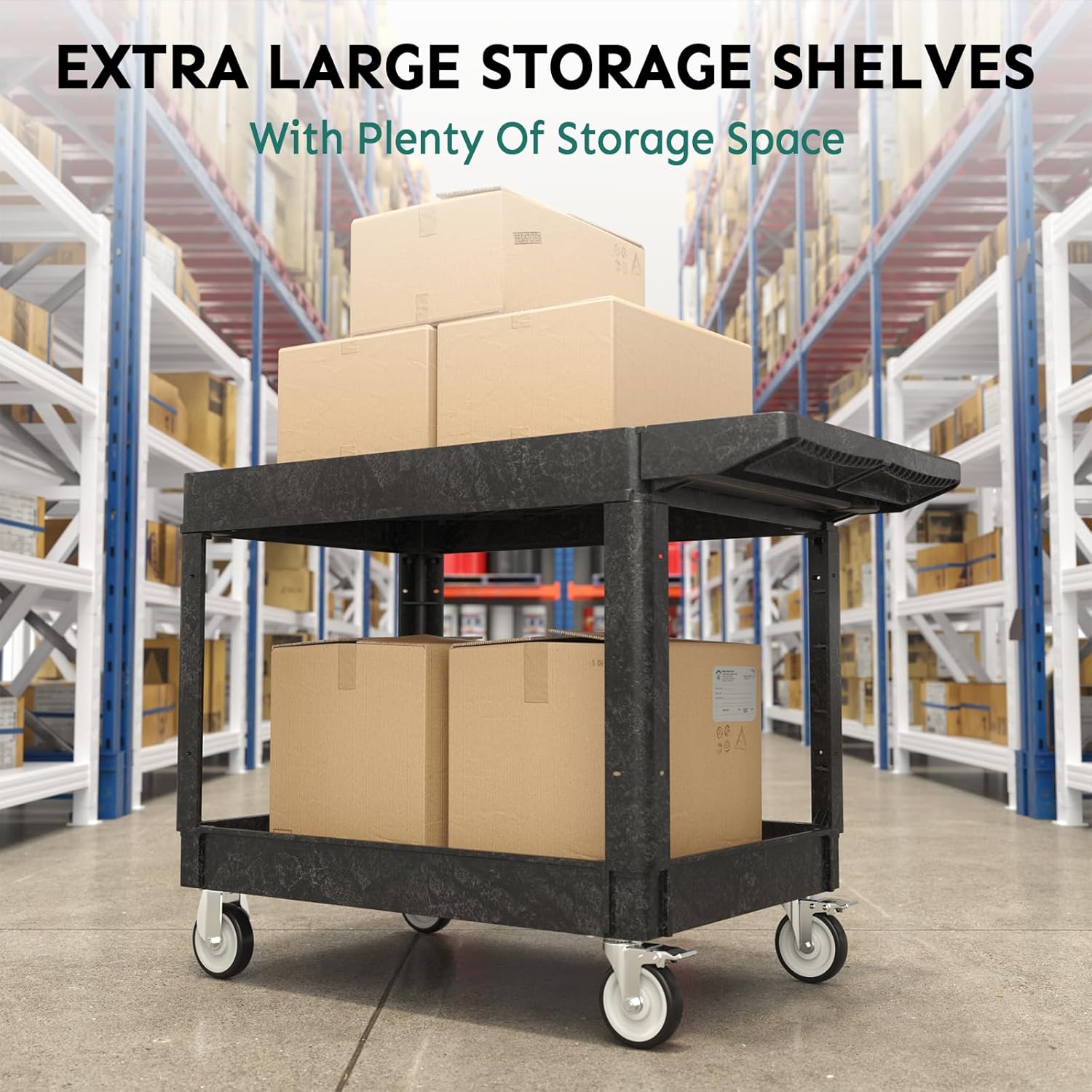 Utility Cart on Wheels, Heavy Duty Large Flat Top Rolling Service Cart, 46 x 25 Inch Work Carts, 2 Shelf 1000 lbs Capacity Plastic Tool Cart, for Warehouse, Garage, Cleaning, Black