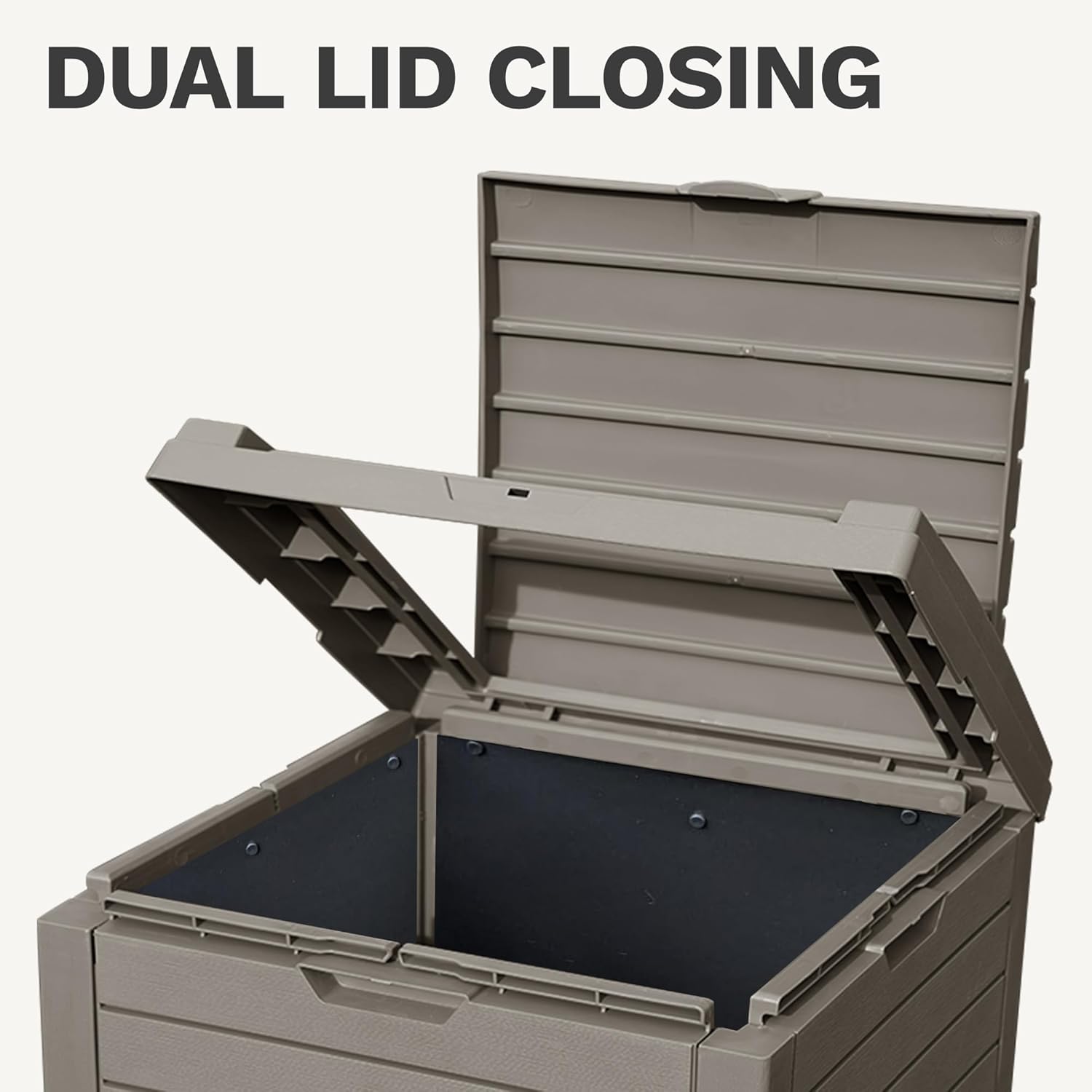 - Dual Lid Design: Our waterproof resin garbage can features a double lid that discreetly hides unsightly garbage bags; The outer lid has a handy clasp for easy one-handed operation, while the inner lid securely holds the garbage bag in place