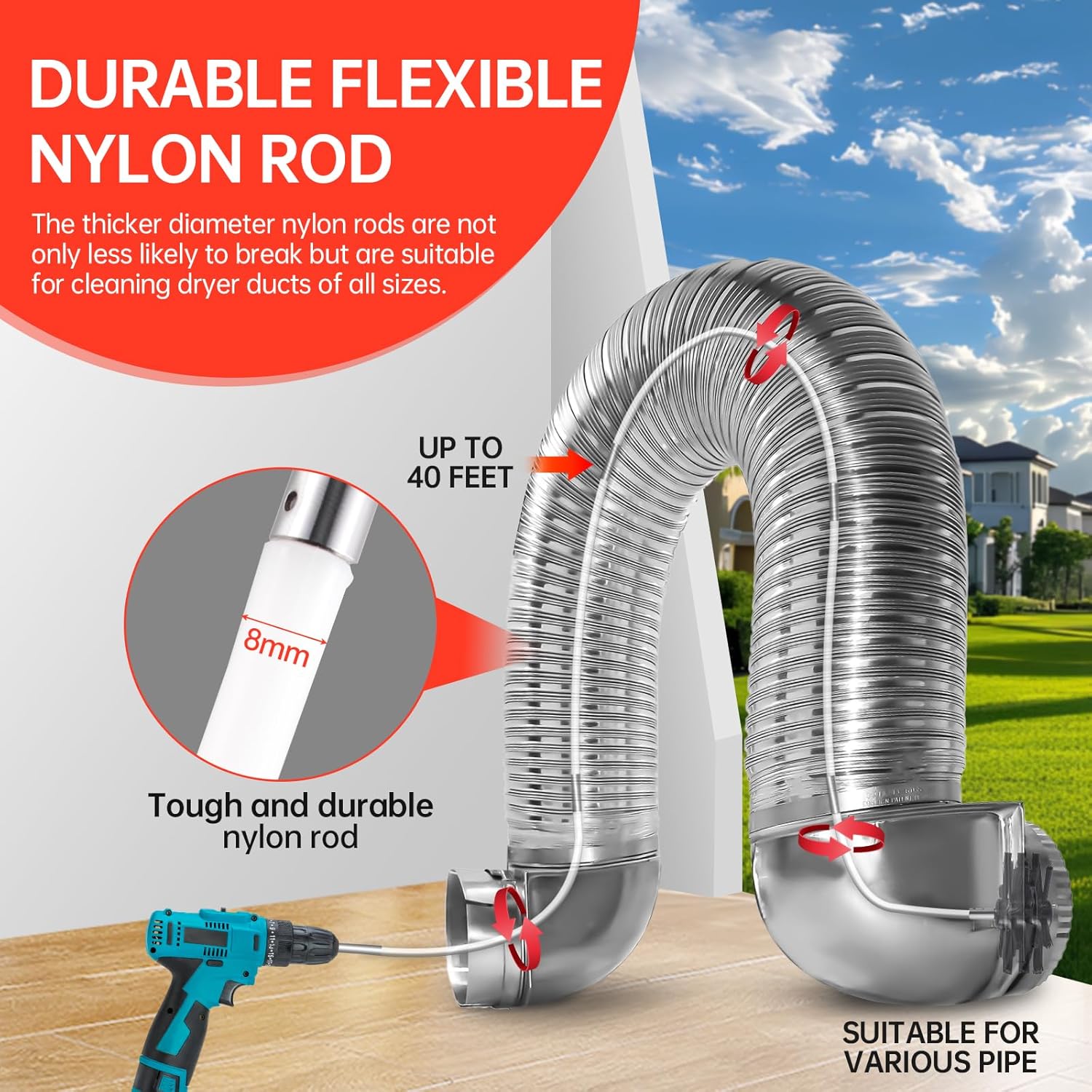 - 【EASY TO USE】:Simply align the joints of the two rods and turn clockwise. The Dryer vent cleaning kit is easy to attach and retract, withstands duct bends of 90 degrees or more, and can be used with or without an electric drill. Each dryer duct cleaning kit provides a metal drill attachment that attaches to an electric drill to quickly and easily clean dryer vents and help you achieve professional results.