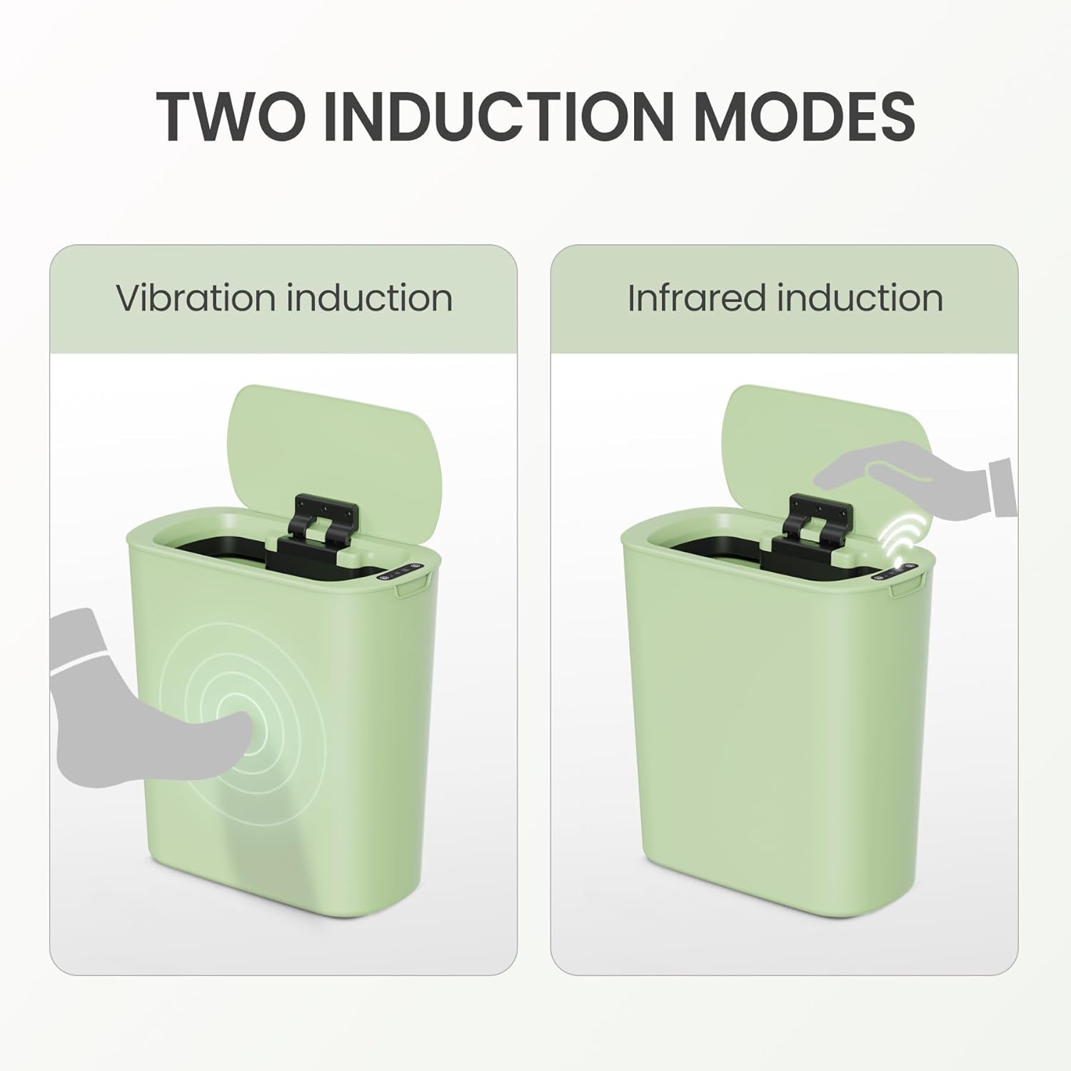 - Countdown Light: If your hand stays in the sensing area, the green light is always on and the lid remains open. When your hand leaves, the green light starts flashing and the lid closes automatically after 5 seconds