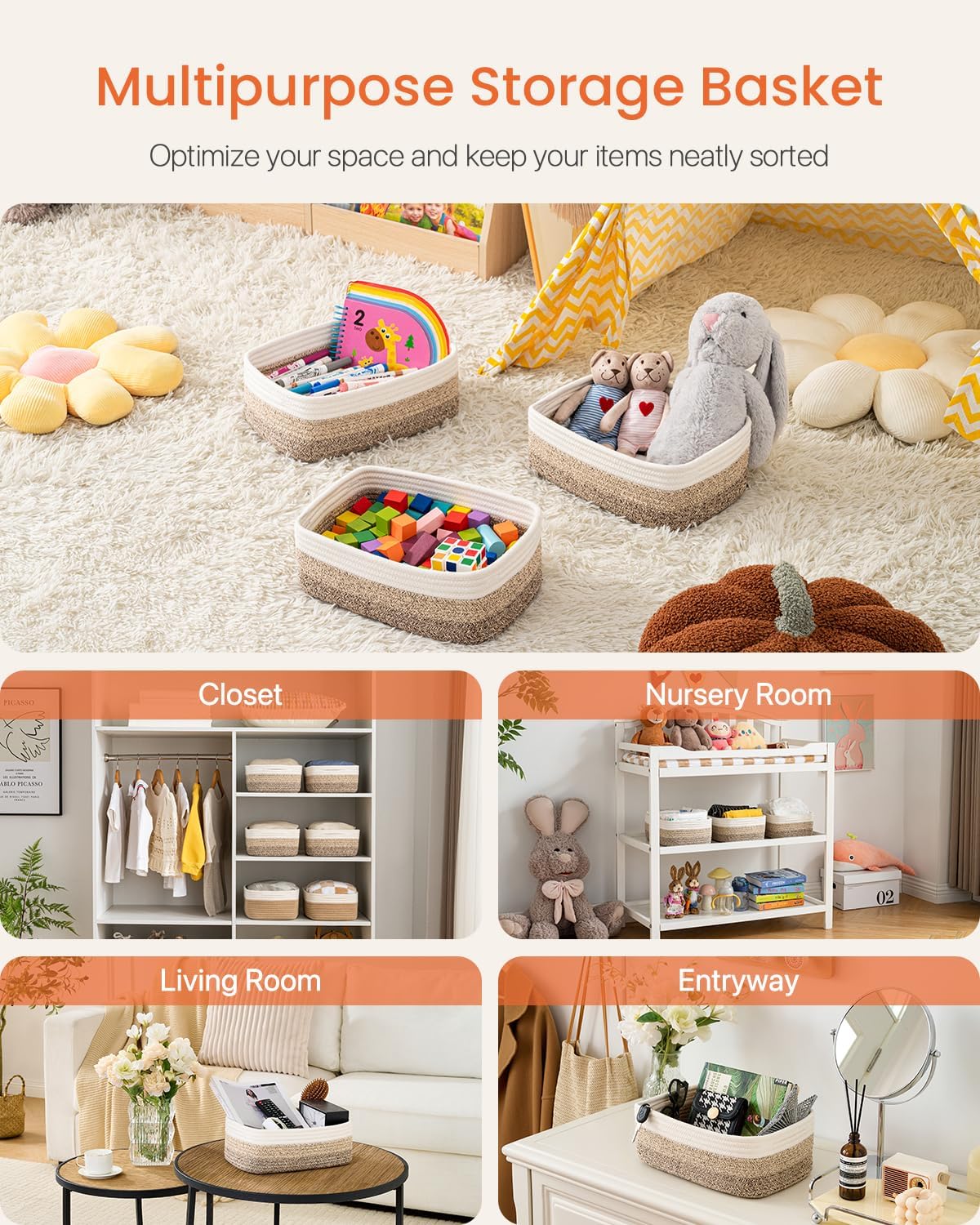 - [ Elegantly Designed to Match Any Décor ] Our small rope basket creates a minimalist appearance, and it adds a touch of warmth and texture to any room. The classic solid color design ensures seamless integration with your existing aesthetics, complementing any decoration. Perfect as decorative storage baskets for shelves, cabinets, and any open display space, making them a stylish and practical addition to any decor, enhancing the overall aesthetics of your room