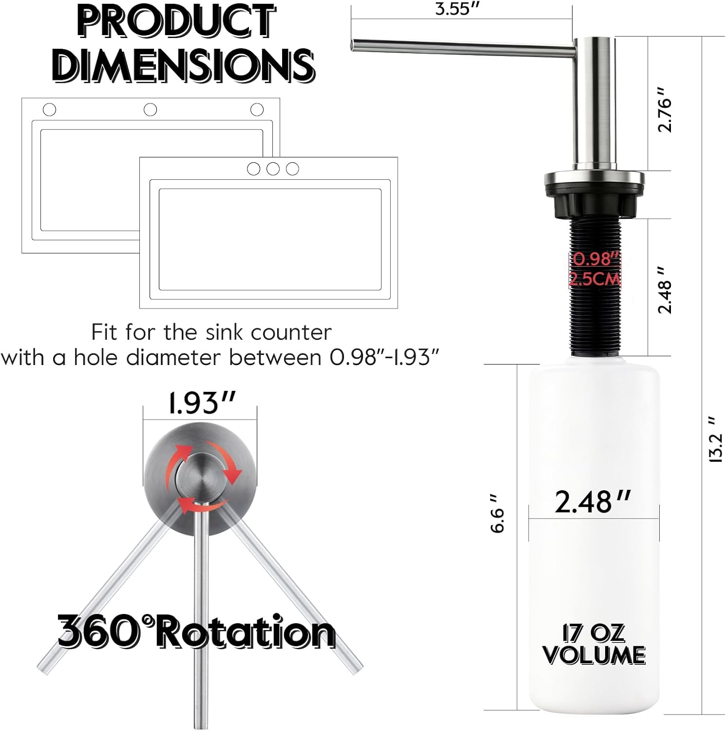 - [Multifunctional Use] This multifunctional sink soap dispenser is engineered for seamless integration in both kitchen and bathroom environments. Equally effective for dispensing dish soap near kitchen sinks and hand soap at bathroom vanities, its universal design accommodates various liquids including hand sanitizer, lotion, and baby shampoo. The corrosion resistant construction ensures long term reliability in high humidity spaces