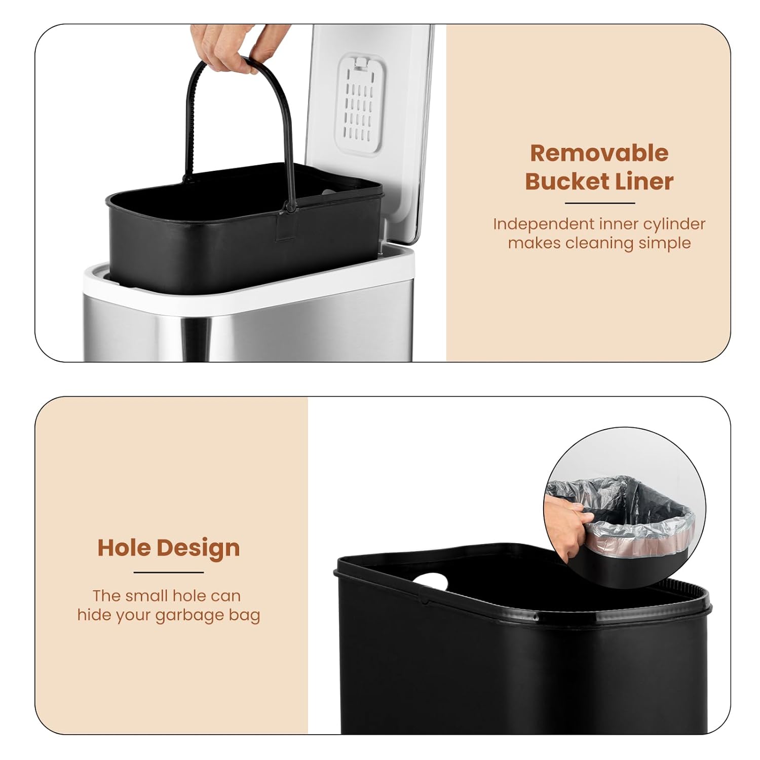 - Removable Plastic Inner Bucket: The bin comes with a removable plastic inner bucket, making it convenient to empty and clean. You can easily take out the inner bucket to dispose of the garbage.