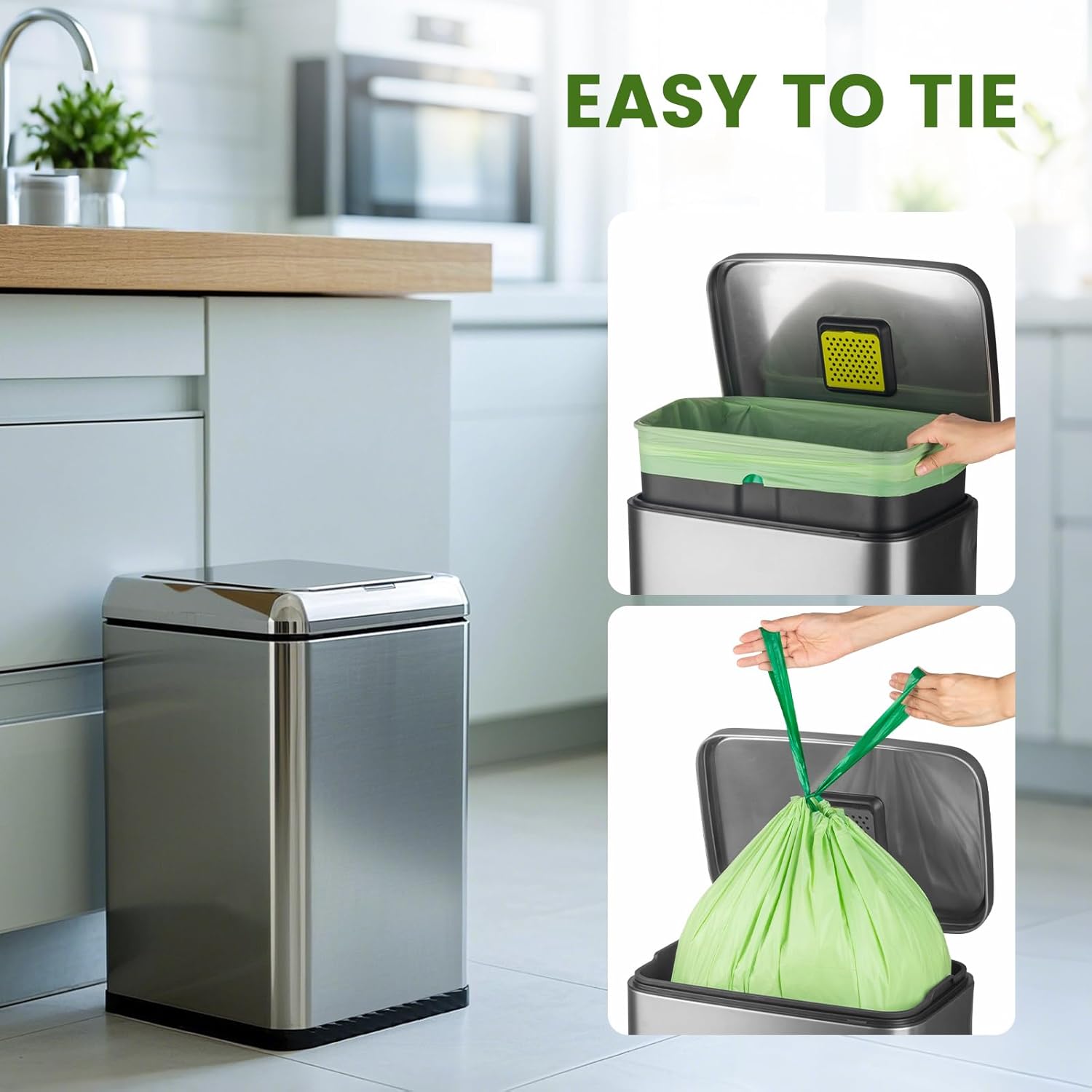 - Product Information: SUPERBIO Compostable Drawstring bags, 4 gallon (15.1L) 17.7 in x 19 in x 0.9 mil, 40 bags per roll, tear free design is convenient