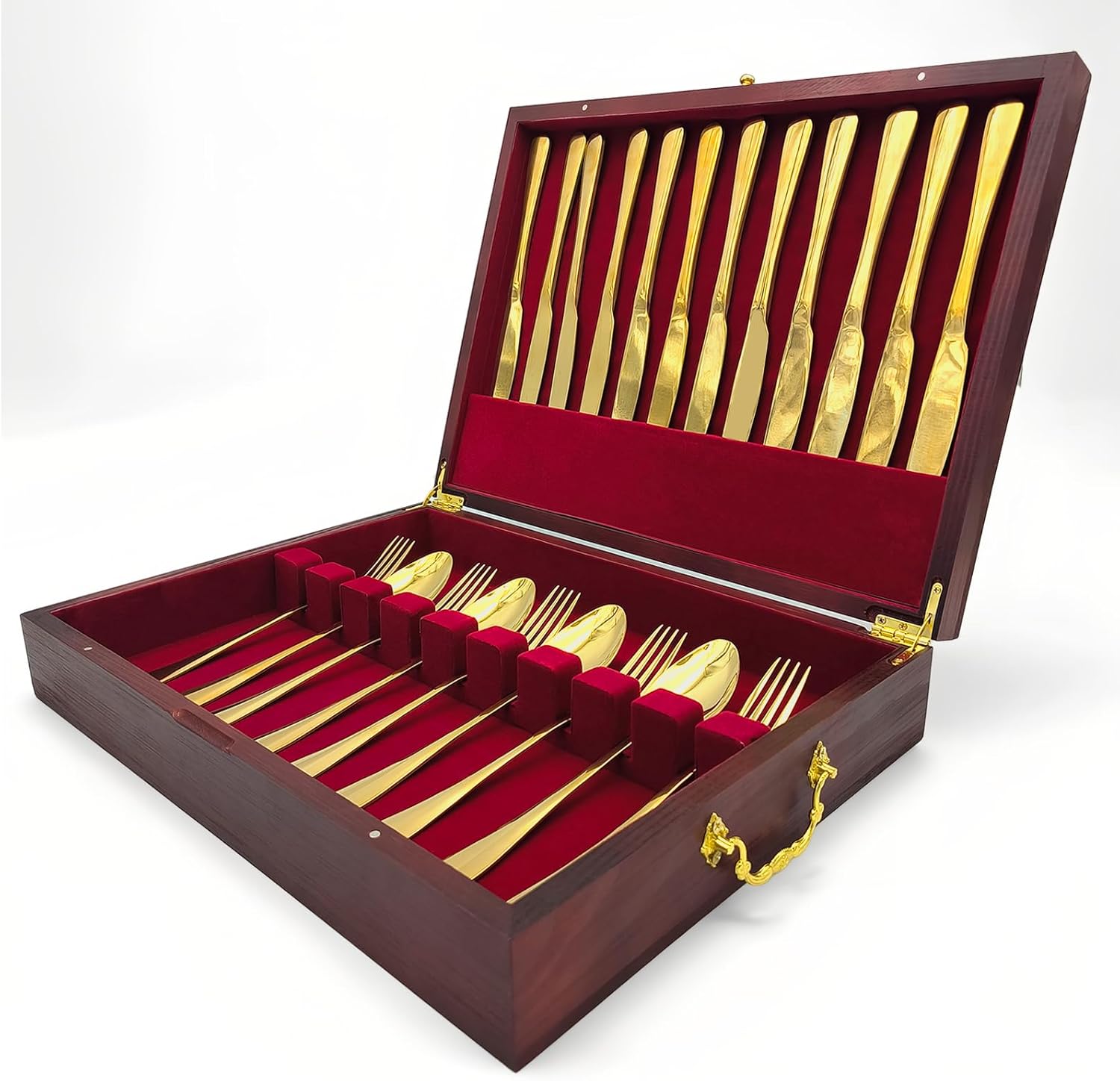 - Convenient Storage with Multi-Slot Racks: The silverware storage box features a 12-slot knife rack on the lid and a 9-slot flatware rack on the bottom, at least 21 knives or forks can be placed. With dimensions of 15.35" W x 11.41" D x 3.15" H, silverware chest's perfectly sized for a sideboard or drawer.
