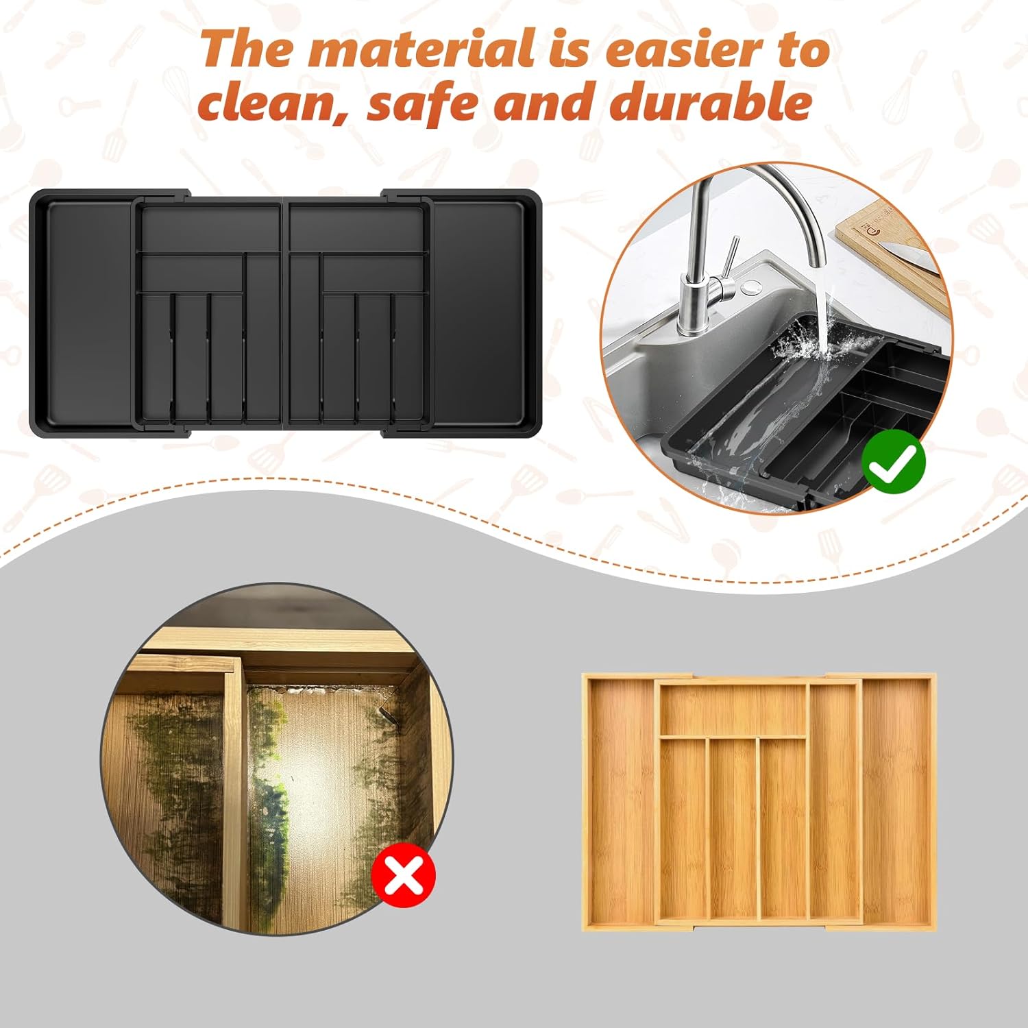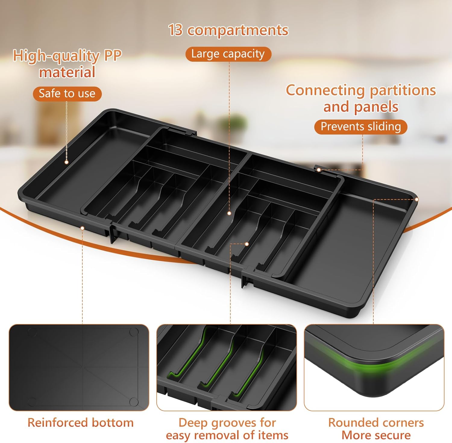 - Expandable design: Equipped with two expandable layers, flexibly adjustable partition design, a total of 14 compartments, easily adapt to tableware of different sizes (knife, fork, spoon/kitchen utensils/baking tools), drawer space utilization, say goodbye to messy storage.