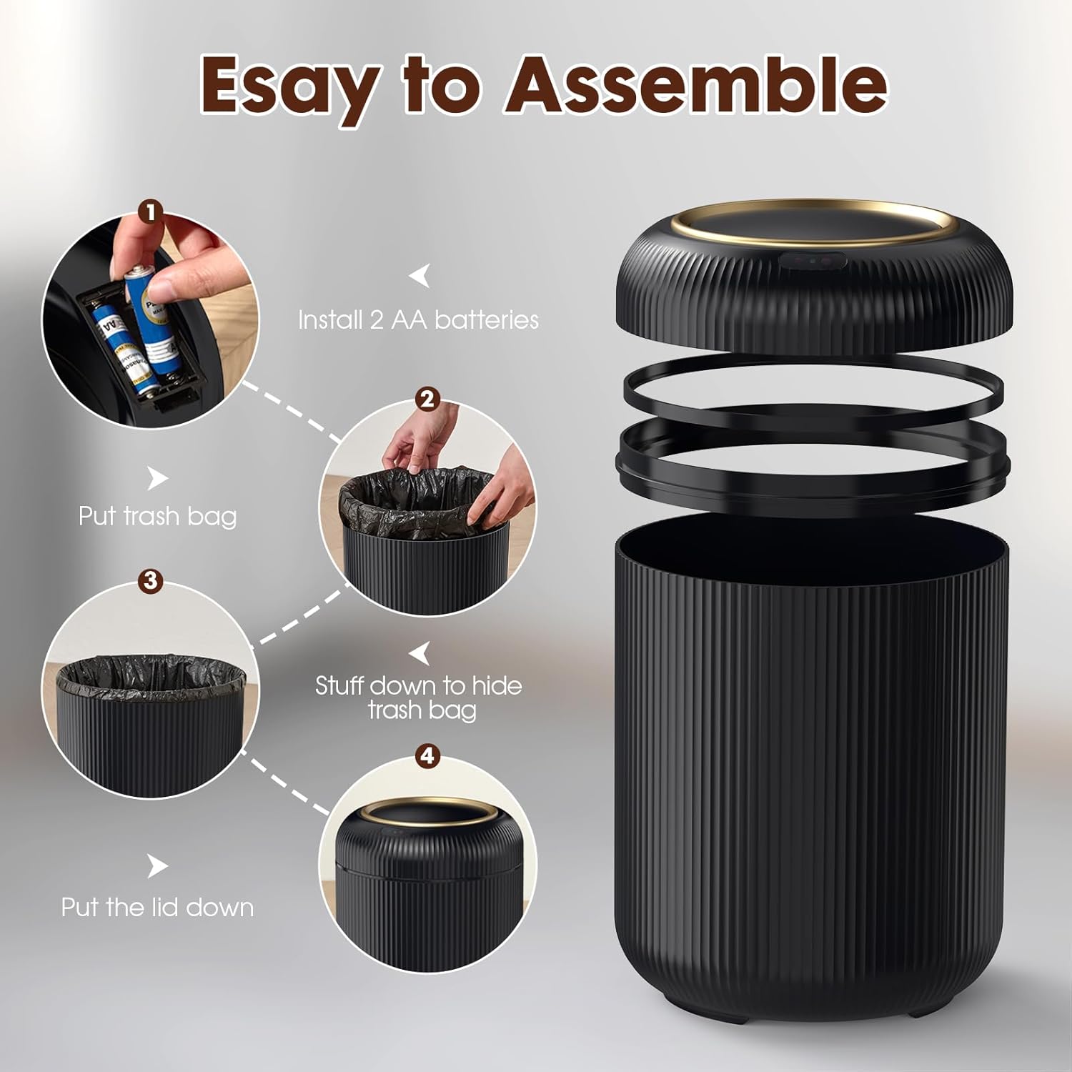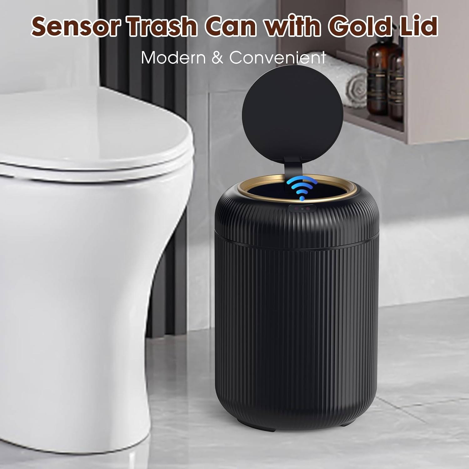 - Modern&Stylish appearance:The office trash cans for near desk is equipped with black and gold lid and novel wave stripes that bring visual aesthetics and provide slip resistance effect. With its unique modern design, the smart trash can is good match to the room decor. It is the perfect partner in your home.
