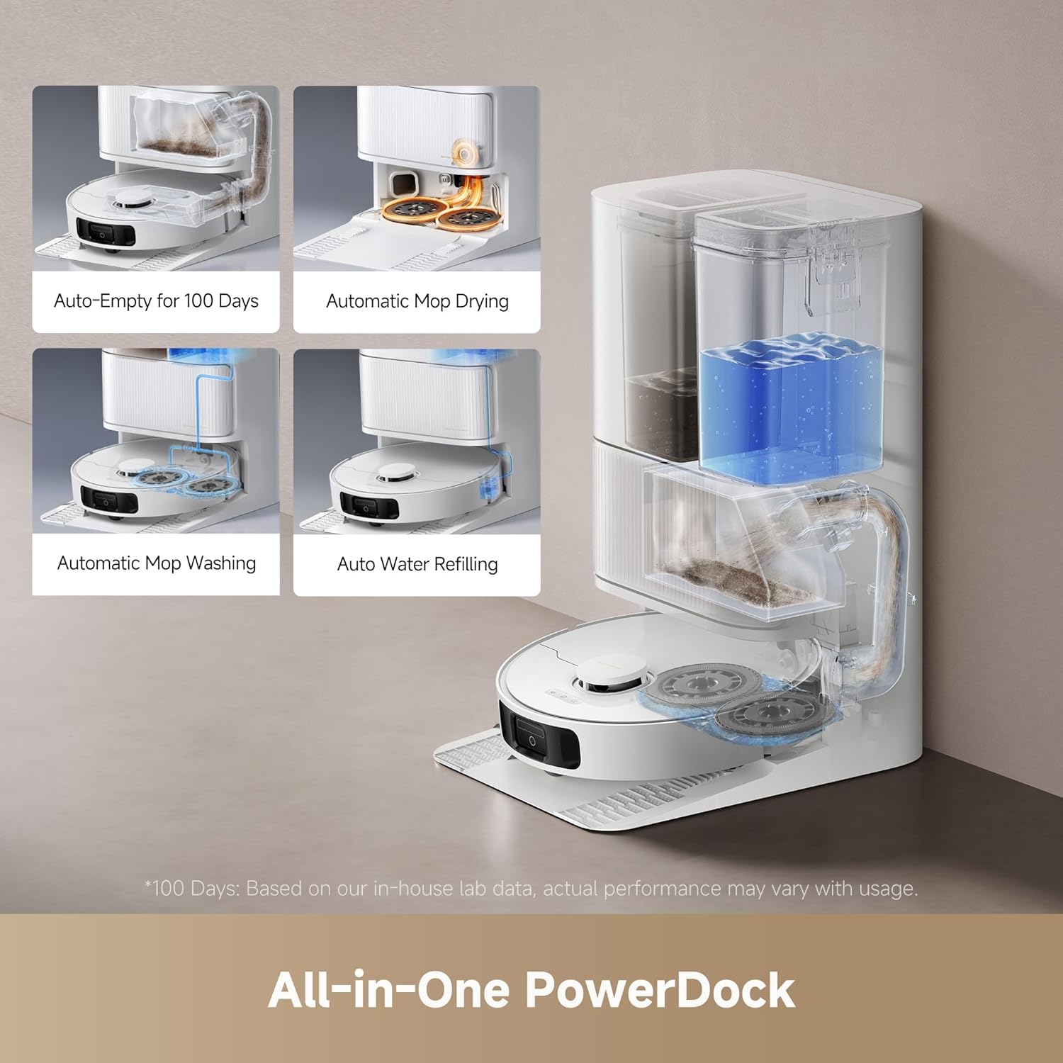 - All-in-One Self-Emptying Base: The robot vacuum self emptying PowerDock station automates maintenance by refilling water, washing mopping pads, and providing hot air drying. As a self-emptying robot vacuum, it holds up to 100 days of dust, offering a truly hands-free cleaning experience.