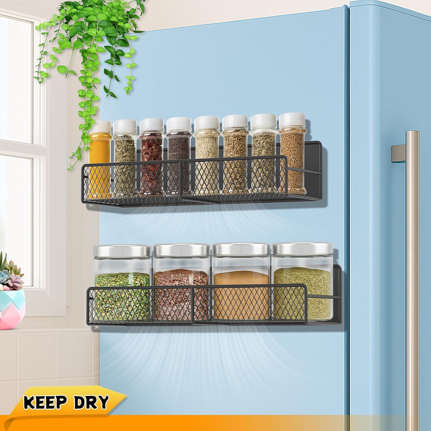 - Upgraded Mesh Metal Design – Built from thick, powder-coated steel mesh, these magnetic spice rack for refrigerator are rustproof, waterproof, and designed to last. The breathable grid structure keeps your spices dry, clean, and visible at a glance