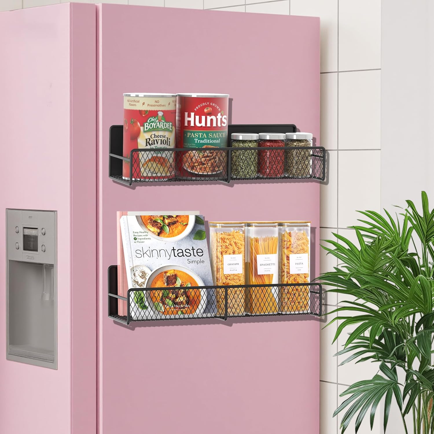 - Compact Space-Saving Storage – Turn unused vertical space into functional storage. Measuring 11.2" and 11.85" wide, these magnetic shelf for fridge hold jars, condiments, or oil bottles without taking up valuable counter or cabinet space