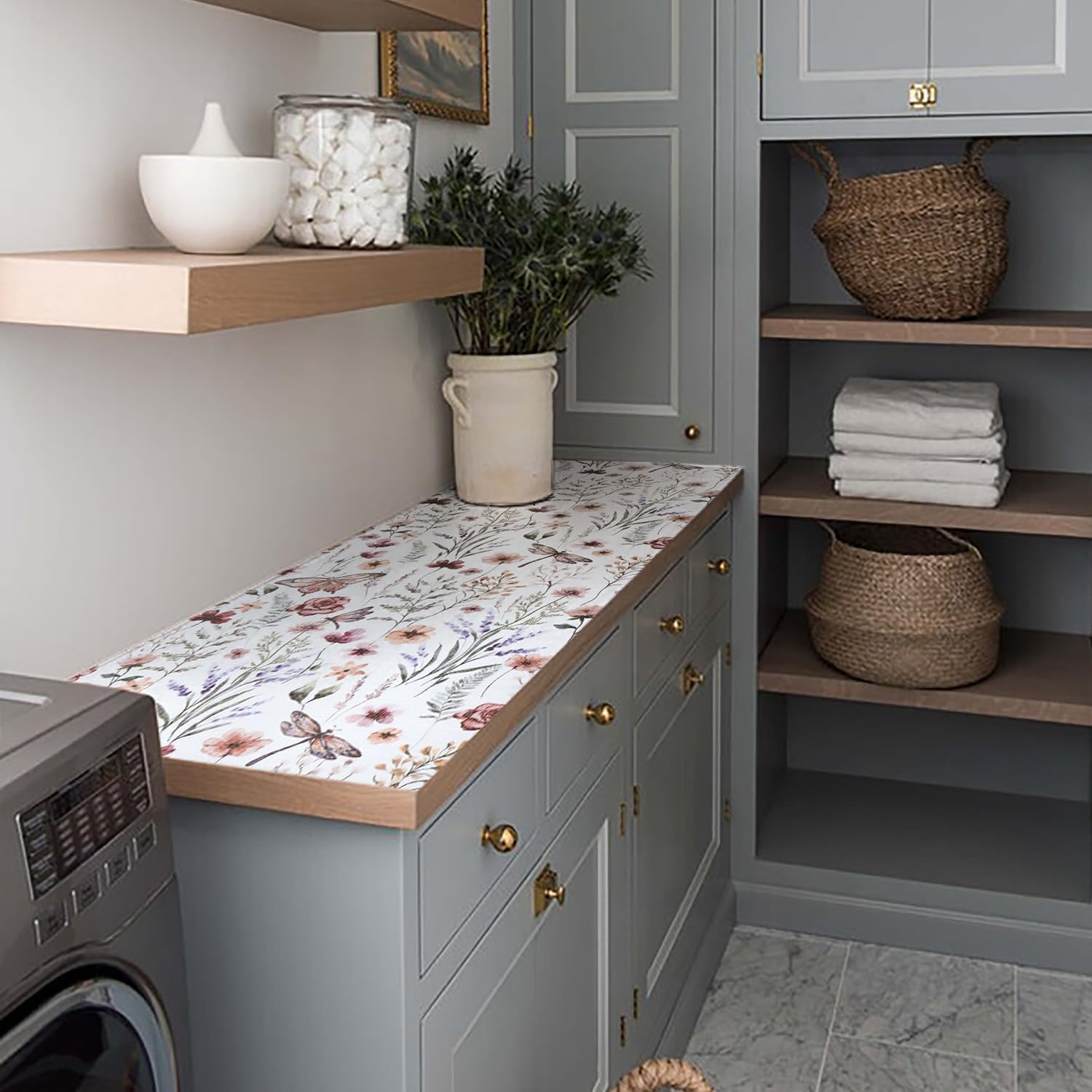 Floral Drawer and Shelf Liner for Kitchen Cabinets,16IN x 20FT Non-Adhesive and Strong Non-Slip Cabinet Drawer Liners for Kitchen Shelf, Waterproof Cupboard Liners,Easy to Clean