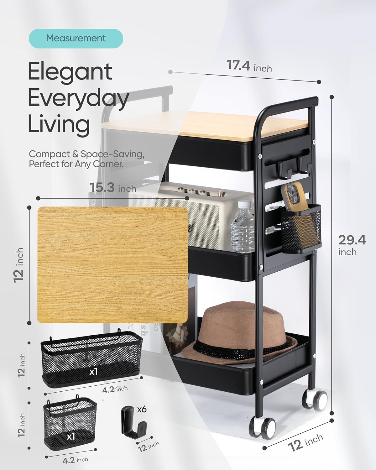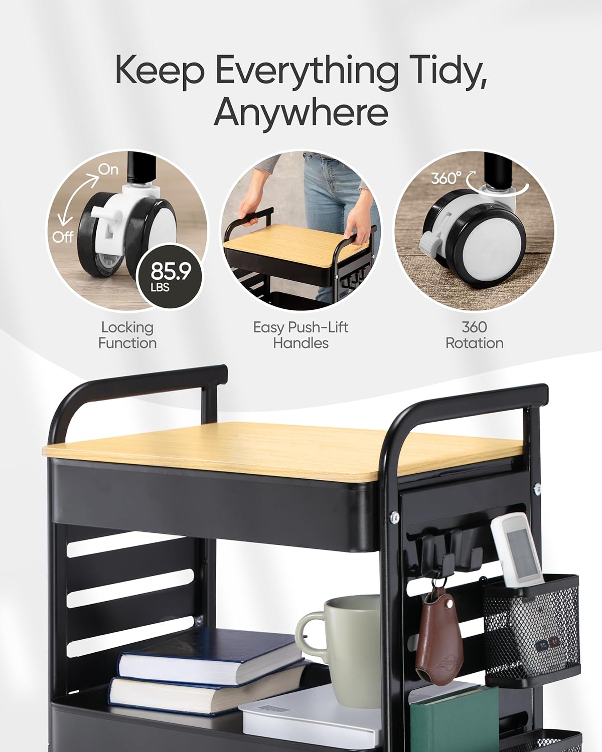 - 🎁【Bonus Accessories for Maximum Convenience】 Enjoy $20 worth of bonus accessories! This cart includes 6 heavy-duty hooks, perfect for hanging kitchen utensils, office supplies, or craft tools. Plus, 2 spacious mesh baskets allow for quick & easy access, ensuring everything stays within reach.