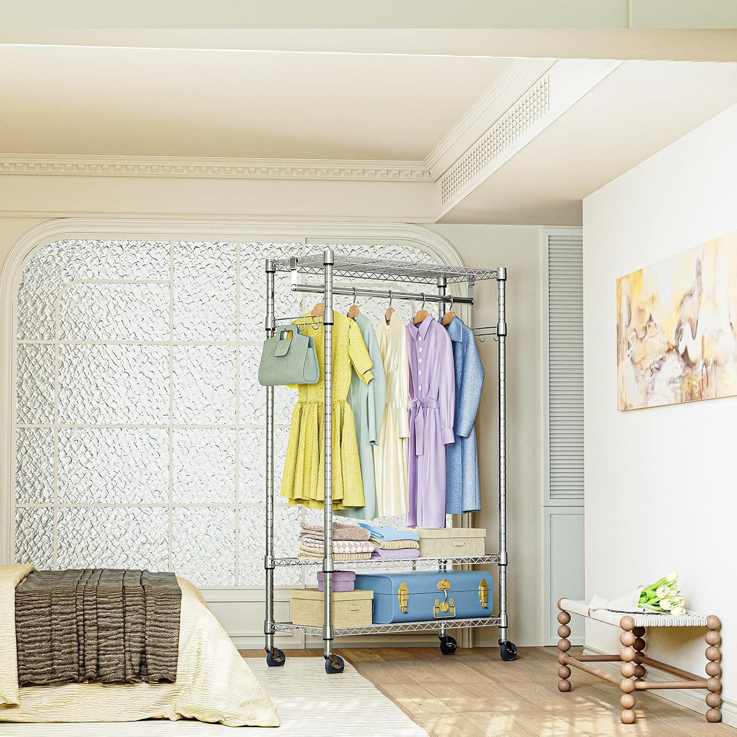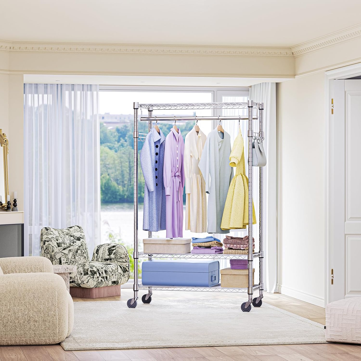 IZEUK Heavy Duty Rolling Garment Rack with 3 Adjustable Wire Shelves, Hanging Rod & Side Hooks - Mobile Clothes Rack with Wheels, 29.5" W x 15.7" D x 75" H,Chrome