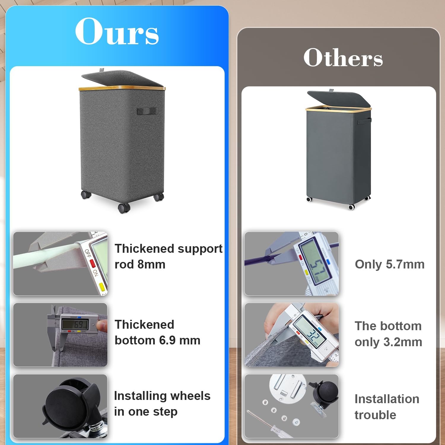 Laundry Hamper with Wheels,29 Gal (110L) Laundry Basket with lid Rolling Clothes Hamper Foldable Dirty Clothes Basket on wheels with Bamboo Frame and Bag for Bedroom, Dorm, Laundry Room-Grey