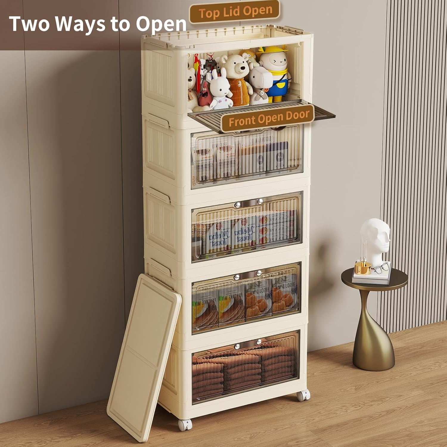 - Two Opening Ways: There are two ways to open the lid storage box. You can open the top cover or open it from the front door. The front cover of each plastic drawer storage is translucent, and you can clearly see the items stored inside, which is a good assistant to our family