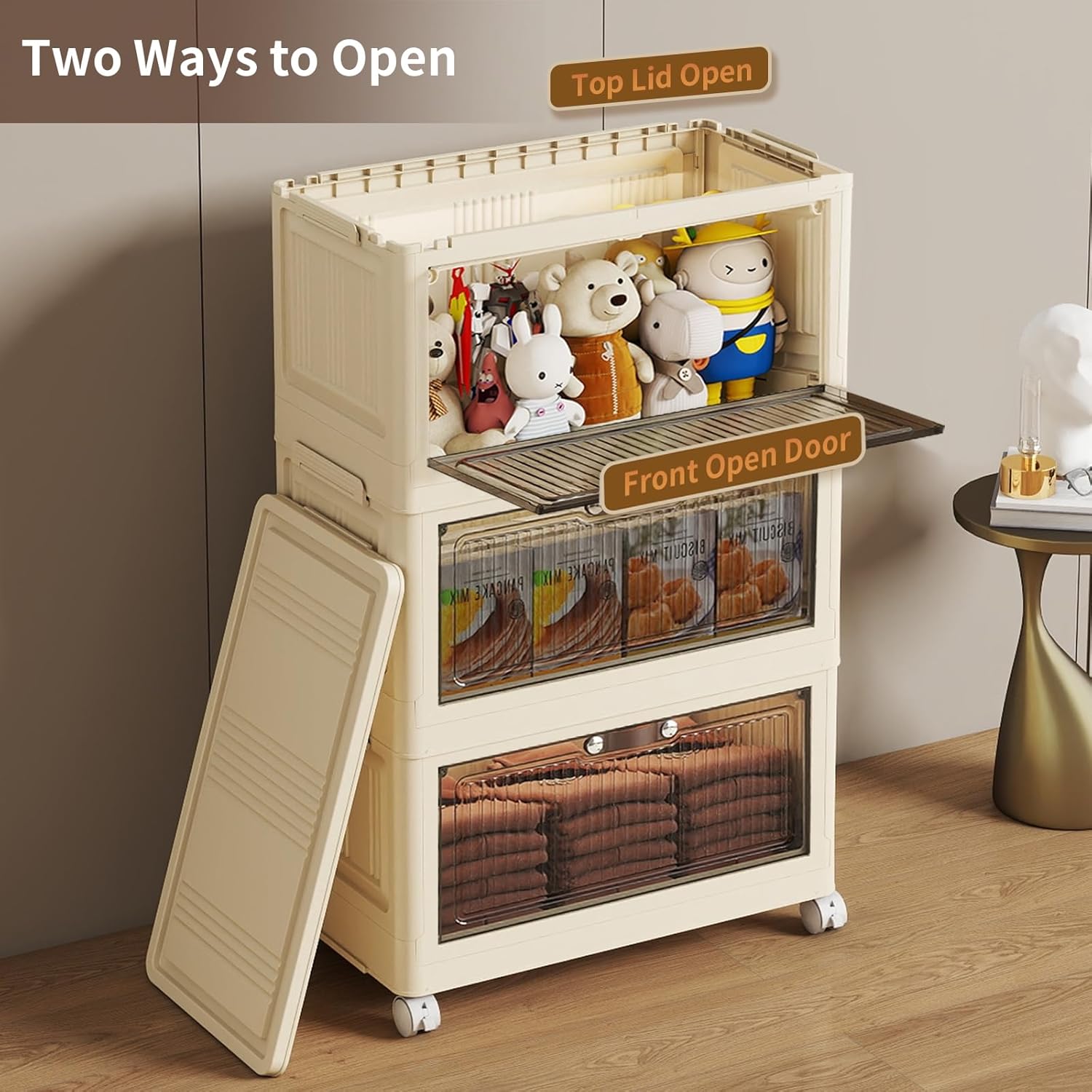 3 Tier - 34QT Storage Bins with Lids, Collapsible Storage Bins with Doors and Wheels, Plastic Storage Cabinet for Easy Storage and Organization for Living Room, Office