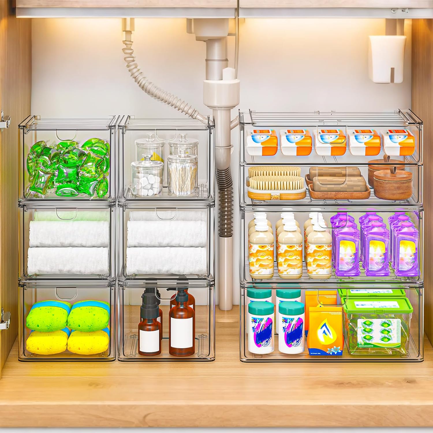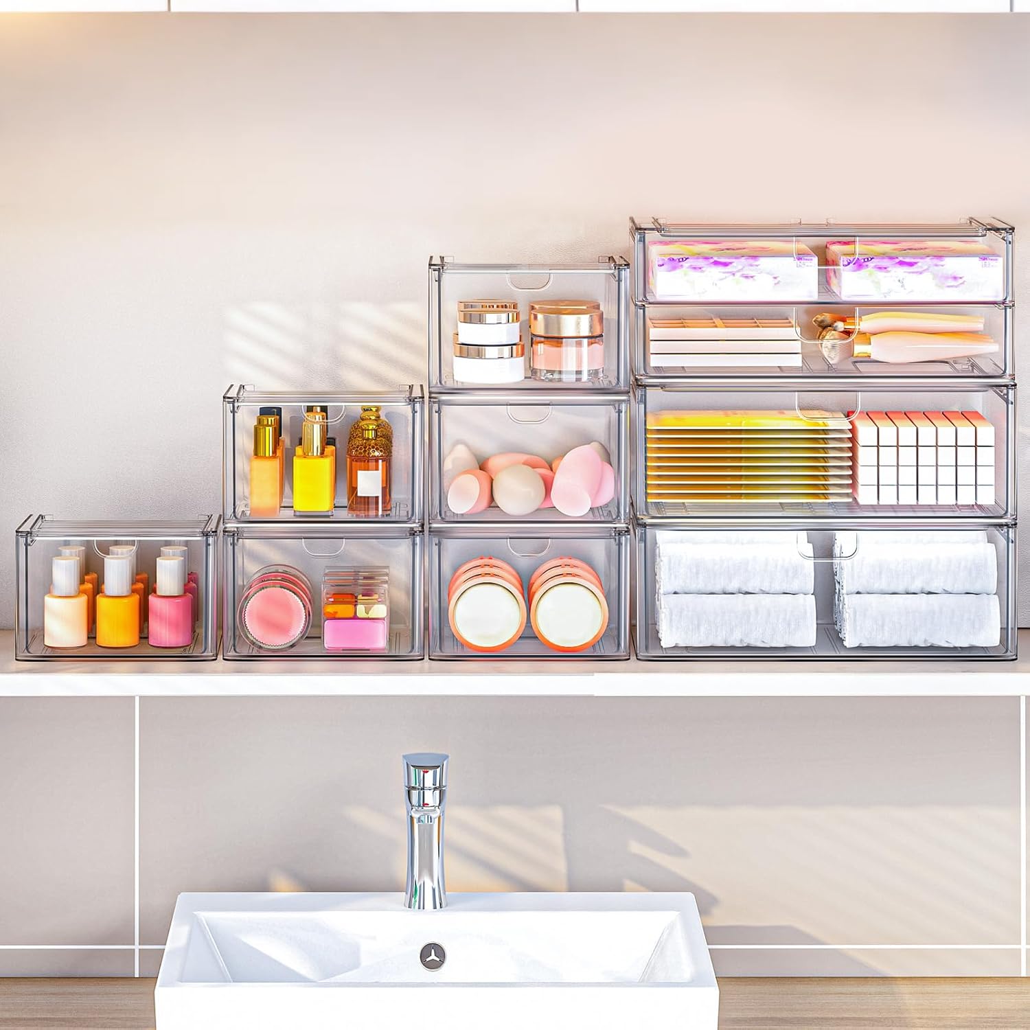 - [Multi-Fit Modular System]-Includes 6 acrylic storage drawers — 2 large (13" W × 4.5" H) and 4 medium (6"W*4"H). The stackable design maximizes vertical space, keeping your countertops clutter-free. With six separate units, you can organize multiple areas in your home — a great value for versatile storage.
