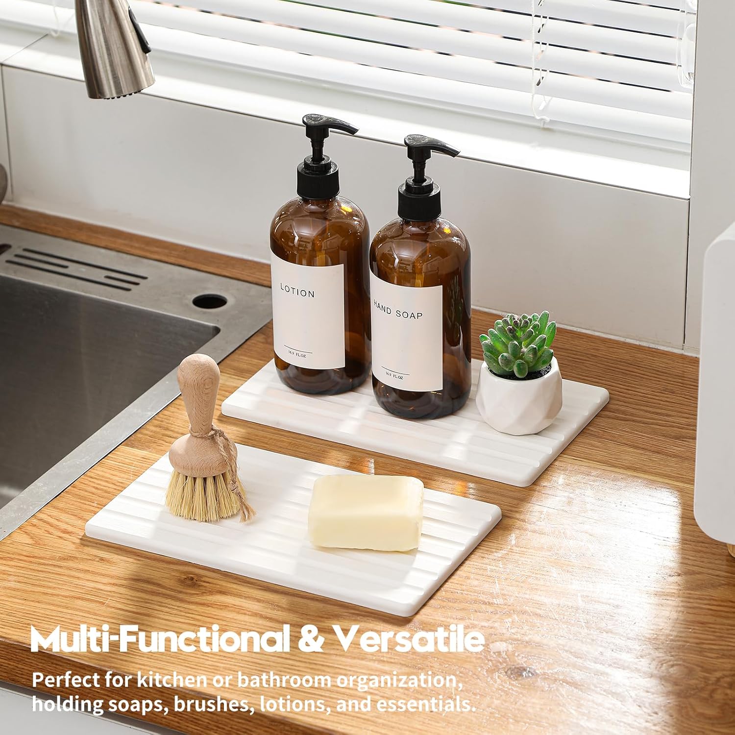 - 【Multifunctional】 Using this instant drying water absorbing tray for your soaps and brushes in the bathroom counter, or by the kitchen sink. The drying stone sink caddy provides you with a neat and orderly space for your home, organizing the hand soap dish, bar coasters, dish washing sponges, makeup bottles coasters, cosmetic bottles soap bottles perfectly