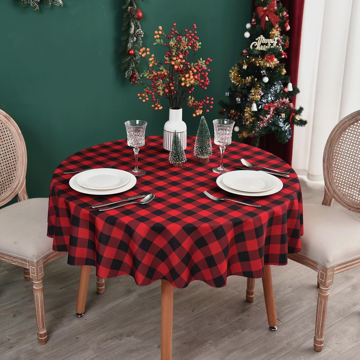Waterproof Plaid Tablecloth Fabric - Round 58 Inch Classic Gingham Checker Table Cloth for Indoor/Outdoor Use - Buffalo Table Cover for Picnics, BBQs, and Parties