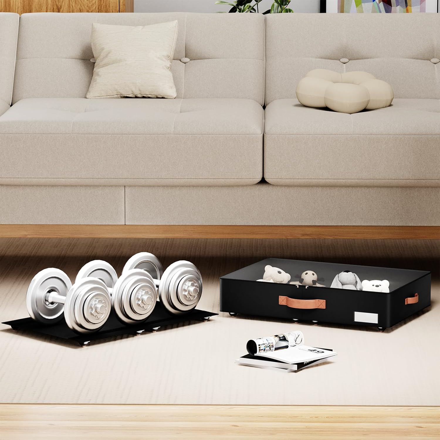 - [No Installation Required]: Say goodbye to complicated setups. Our underbed storage bins can be used directly without the need for installing the bottom and wheels. It's incredibly simple and convenient. Plus, the bottom and upper storage bins can be separated, offering you more versatile usage options. When the upper storage bins are placed in the cabinet, the bottom plate can be used as a shoe rack alone.
